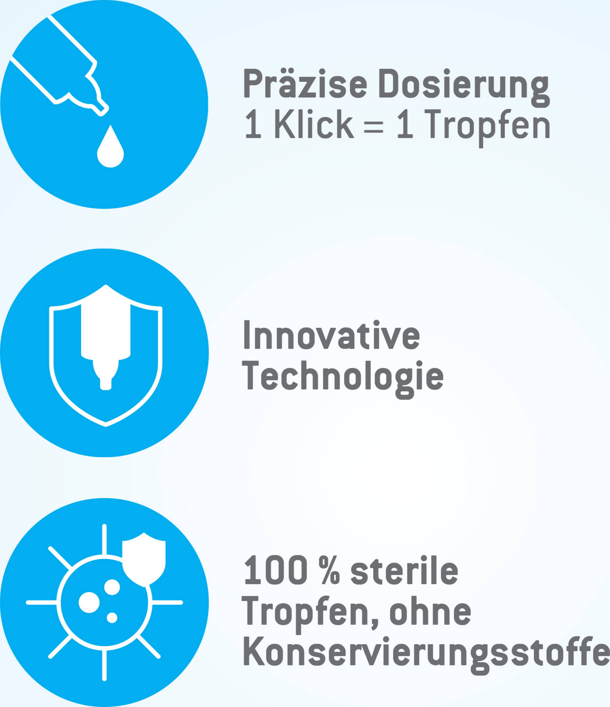 Die Tropfen je nach Bedarf mehrmals täglich anwenden. Bei sachgemäßer Anwendung reicht eine Flasche für 30 Tage. Bei längerer Anwendung konsultieren Sie bitte Ihren Arzt. Bei Bedarf 1 - 2 Tropfen in das betroffene Auge träufeln und mehrmals blinzeln, um die Tropfen gleichmäßig auf dem Auge zu verteilen. Die Augentropfen sind konservierungsmittelfrei und daher für die Augen unschädlich.