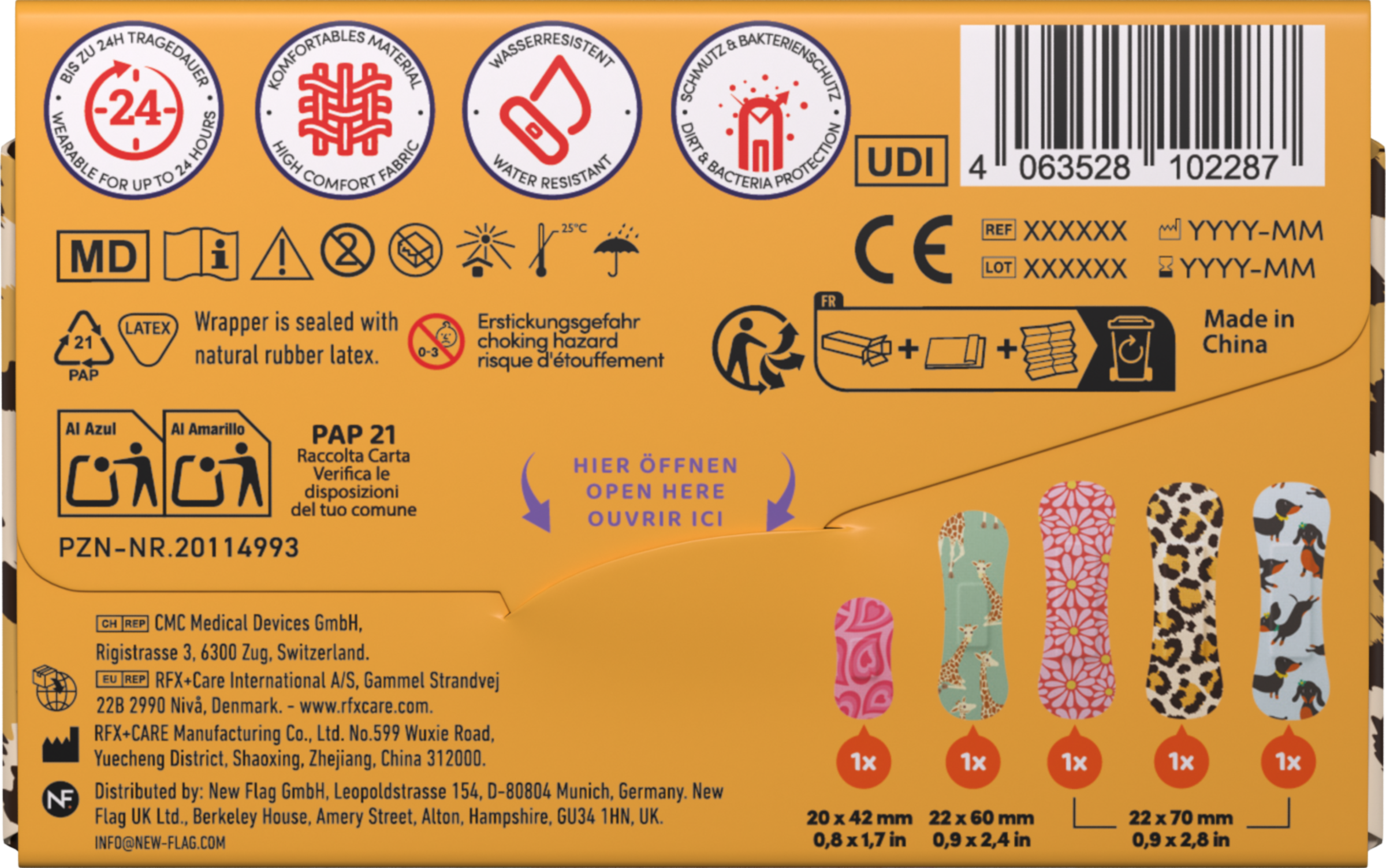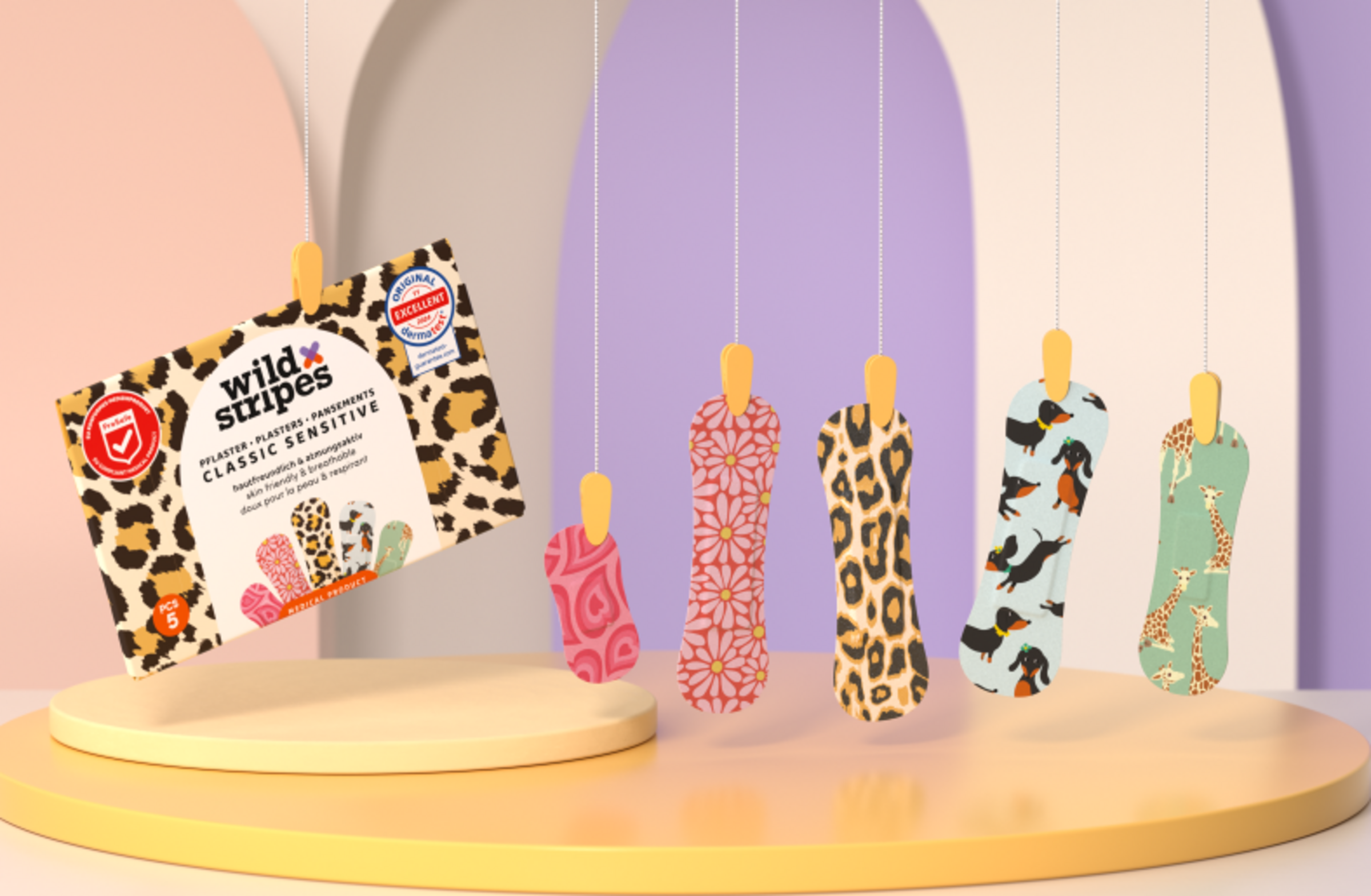 Wild Stripes Classic Sensitive Animal Pflaster sind EU-konforme Medizinprodukte, die mehr als nur einen Wundschutz bieten. Hypoallergen und hautfreundlich, bietet das Pflaster super starken Halt und effektiven Schutz vor Schmutz und Bakterien. Die Classic Sensitive Animal Pflaster sind wasserresistent, ermöglichen bis zu 24 Stunden Tragedauer und das Entfernen ist komplett schmerzlos. Das einzigartigen Designs von Wild Stripes und die patentierten Formen ermöglichen einen einzigartigen stylischen Schutz für kleine Wunden.