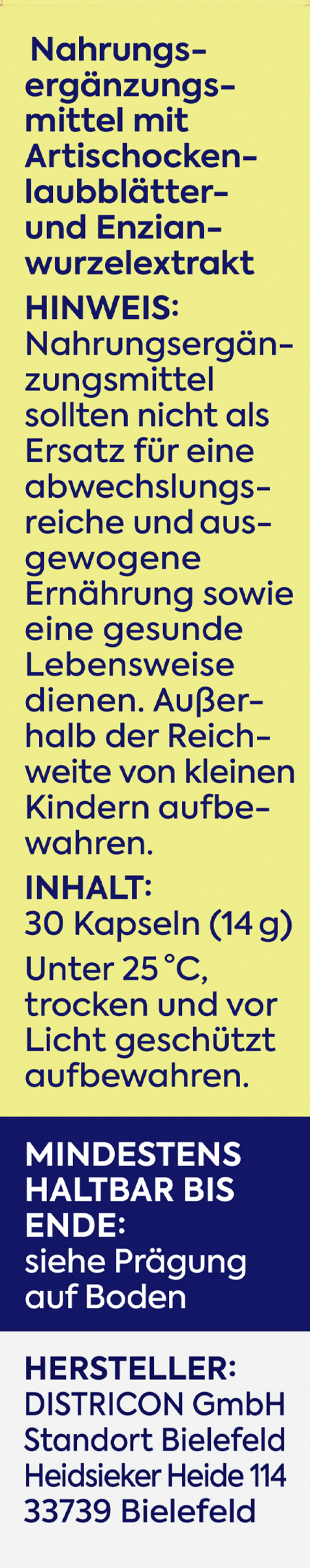 Artischockenlaubblätterextrakt (54 %), Hydroxypropylmethylcellulose, Enzianwurzel-Extrakt (22 %).
