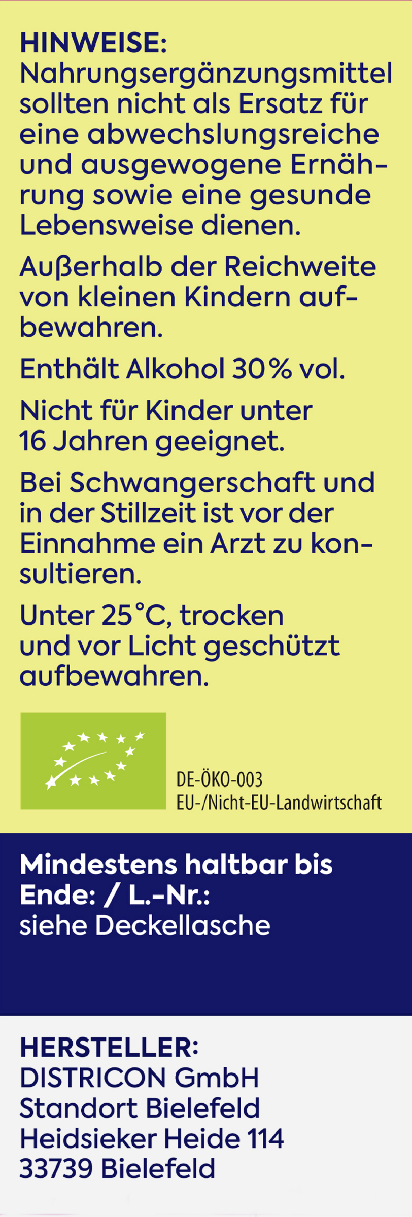 Nahrungsergänzungsmittel sollten nicht als Ersatz für eine abwechslungsreiche und ausgewogene Ernährung sowie eine gesunde Lebensweise dienen. Enthält 30 % vol Alkohol. Nicht Kinder unter 16 Jahren geeignet.