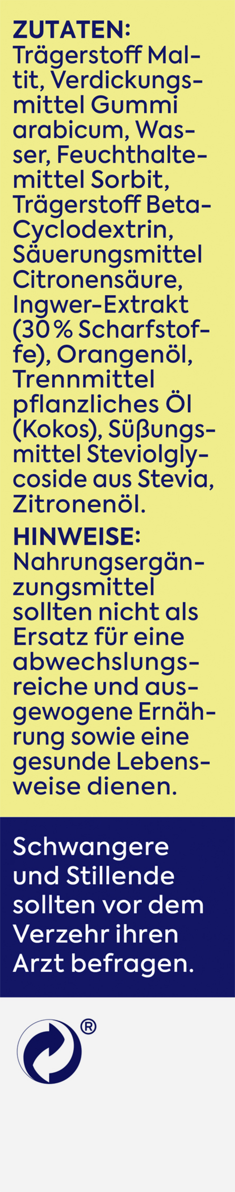 Trägerstoff Maltit, Verdickungsmittel Gummi arabicum, Wasser, Feuchthaltemittel Sorbit, Trägerstoff Beta-Cyclodextrin, Säuerungsmittel Citronensäure, Ingwer-Extrakt (30% Scharfstoffe), Orangenöl, Trennmittel pflanzliches Öl (Kokos),Süßungsmittel Steviolglycoside aus Stevia, Zitronenöl