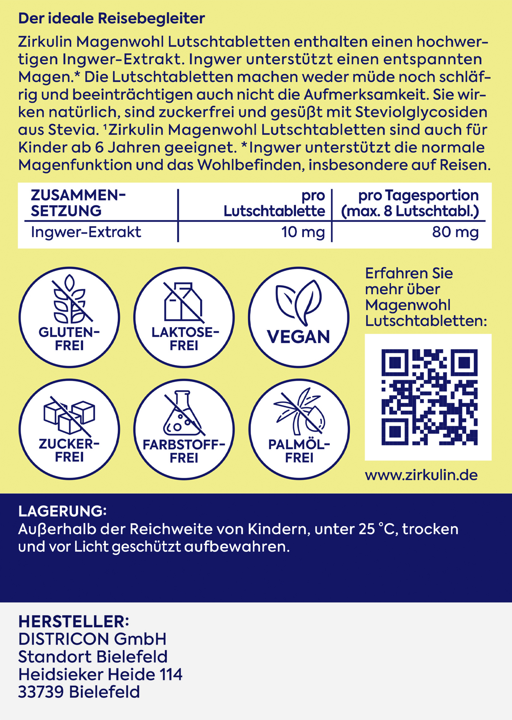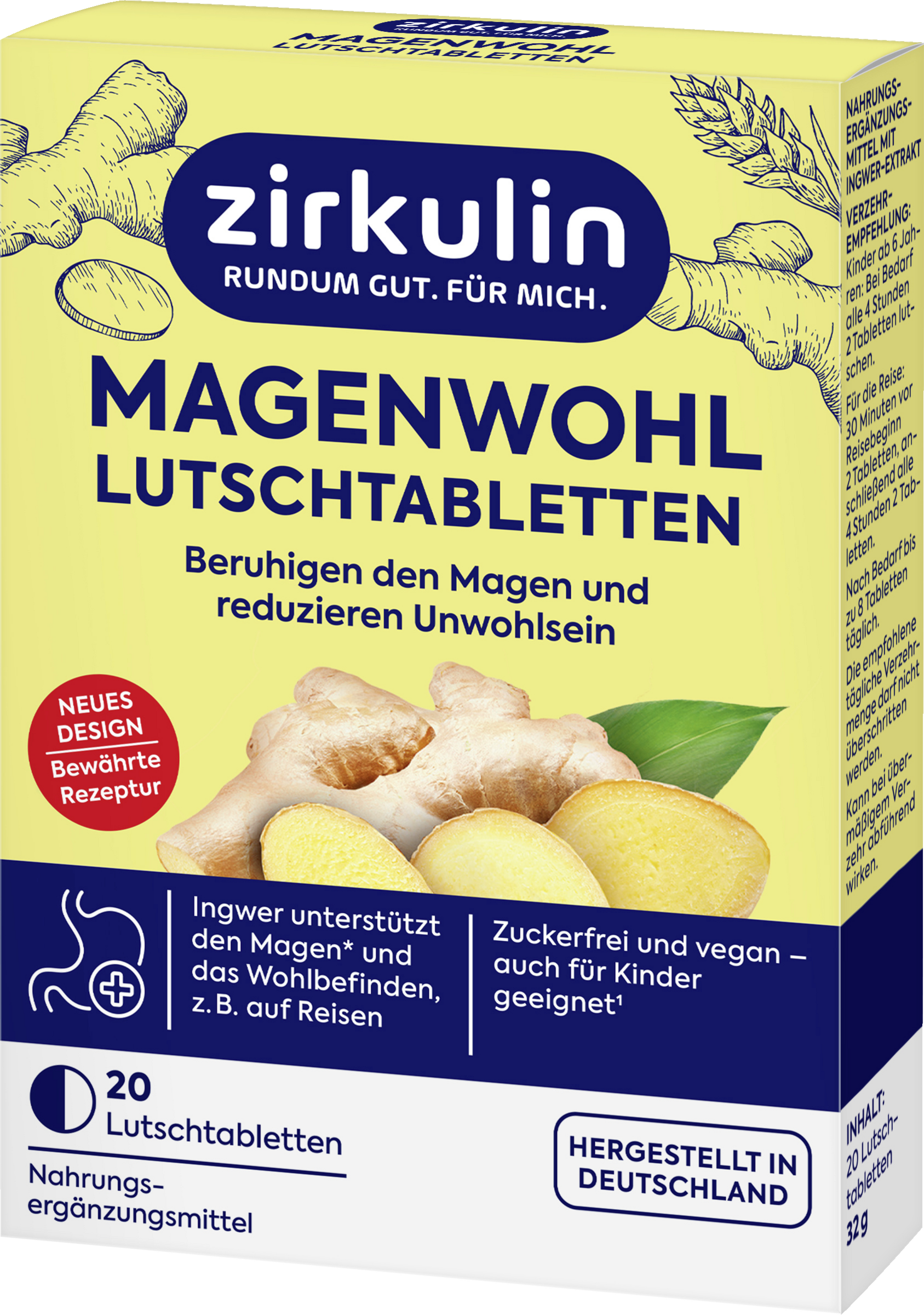 Zirkulin Magenwohl Lutschtabletten enthalten einen hochwertigen Ingwer-Extrakt. Ingwer unterstützt einen entspannten Magen*. Die Magenwohl Lutschtabletten machen weder müde noch schläfrig und beeinträchtigen auch nicht die Aufmerksamkeit. Das macht sie zum idealen Reisebegleiter. Sie wirken natürlich, sind zuckerfrei und gesüßt mit Steviolglycosiden aus Stevia. Zirkulin Magenwohl Lutschtabletten sind auch für Kinder ab 6 Jahren geeignet.
