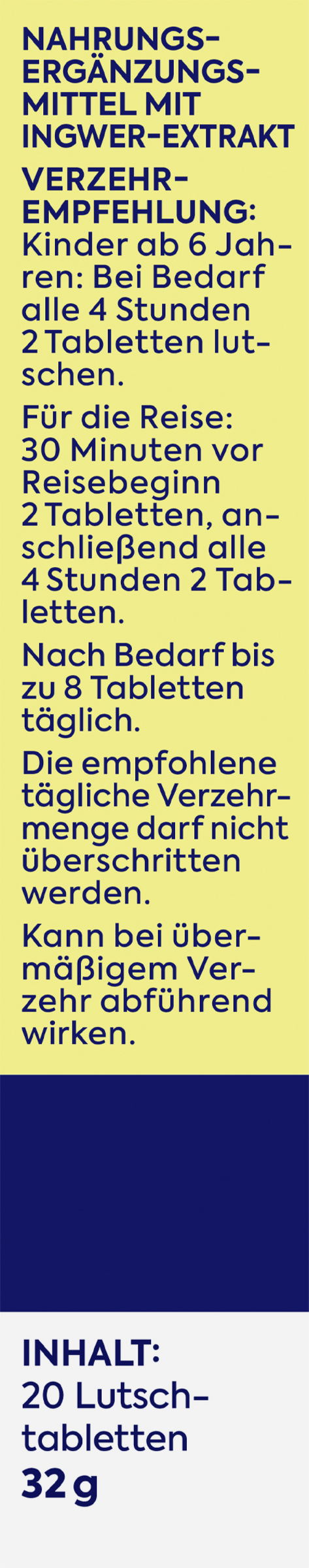 Erwachsene und Kinder ab 6 Jahren: Bei Bedarf alle 4 Stunden 2 Tabletten lutschen. Für die Reise: 30 Minuten vor Reisebeginn 2 Tabletten, anschließend alle 4 Stunden 2 Tabletten. Nach Bedarf bis zu 8 Tabletten täglich.