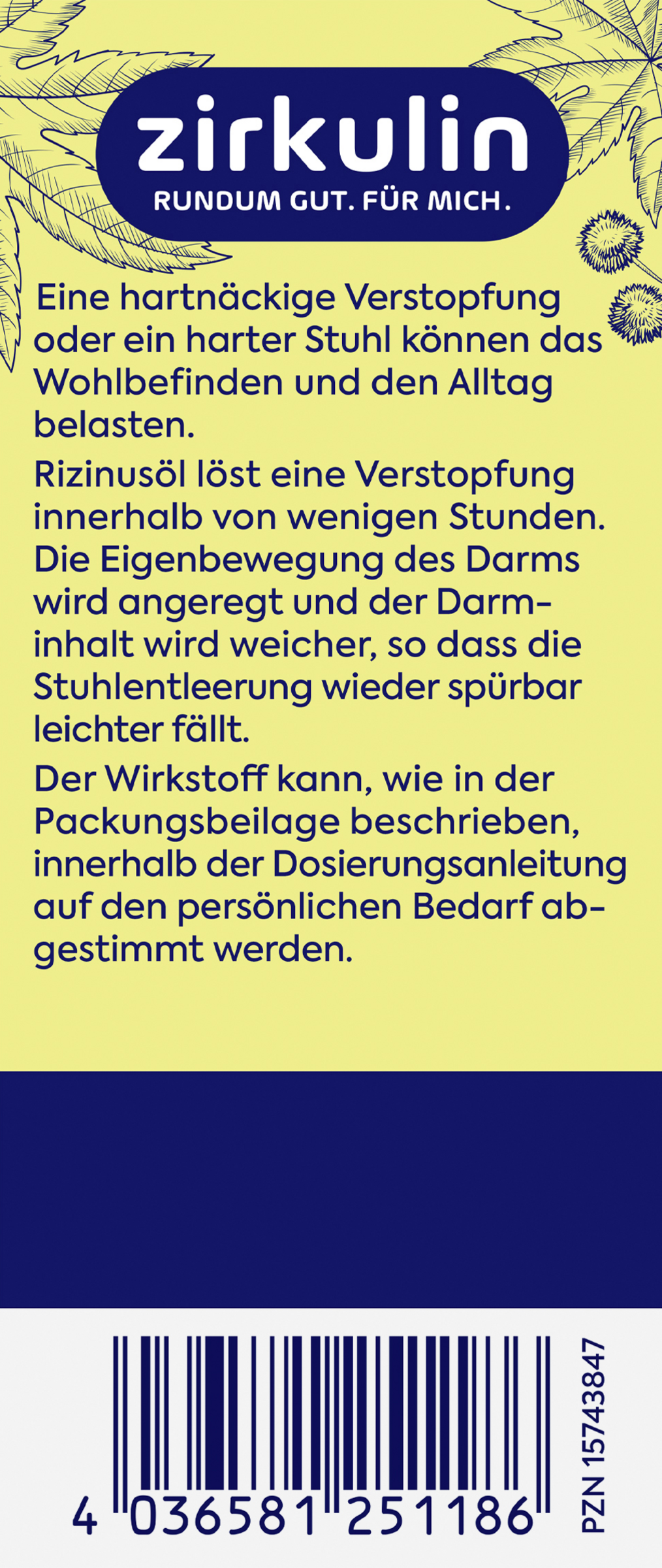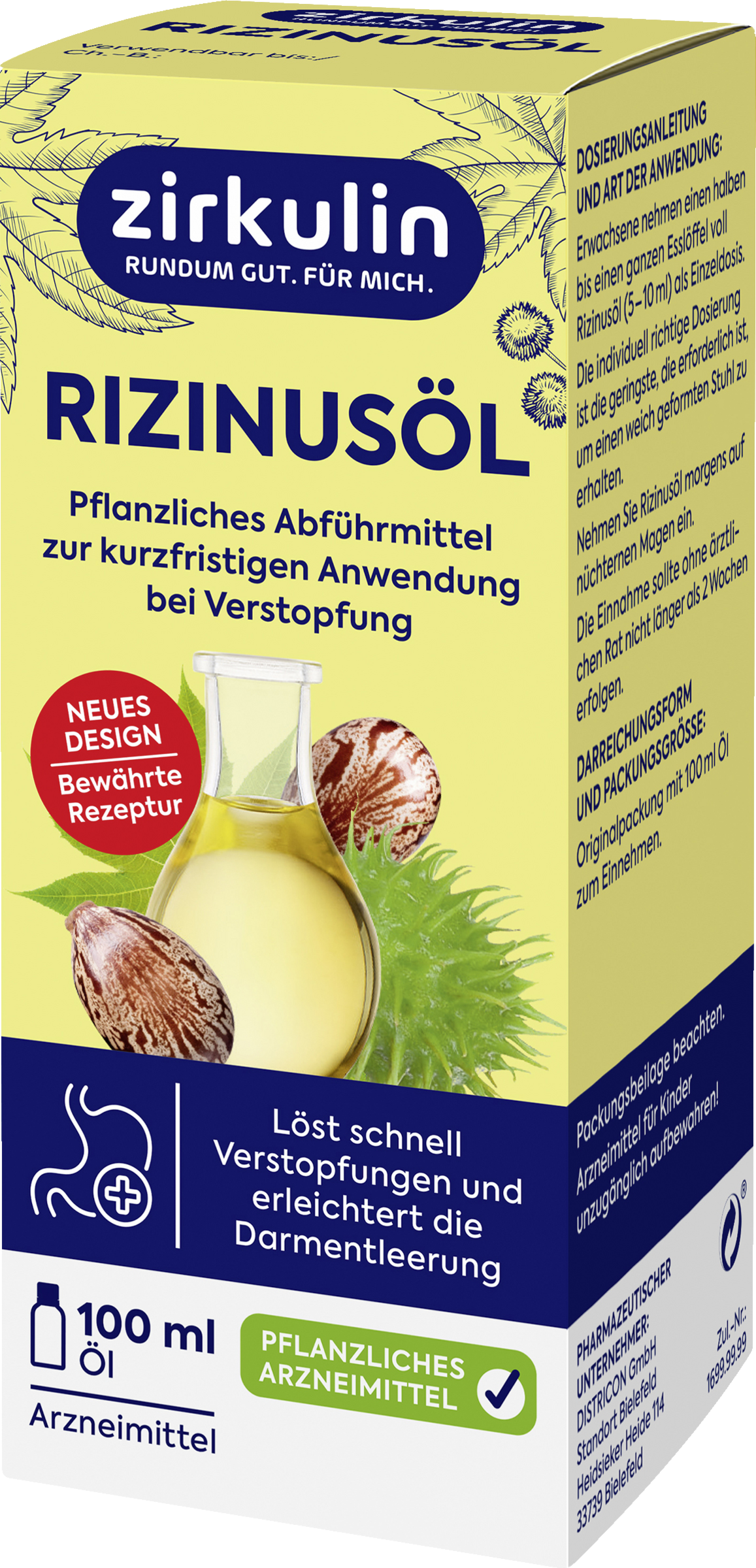 Rizinusöl löst eine Verstopfung innerhalb von wenigen Stunden. Die Eigenbewegung des Darms wird angeregt und der Darminhalt wird weicher, so dass die Stuhlentleerung wieder spürbar leichter fällt.