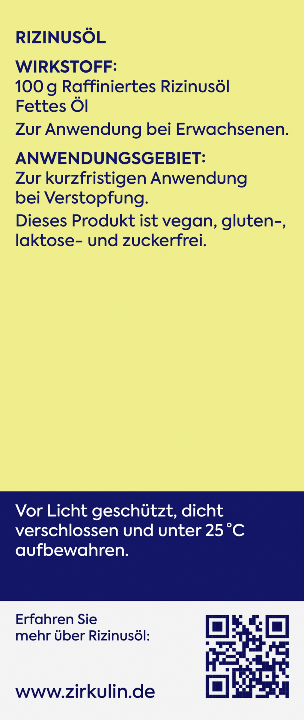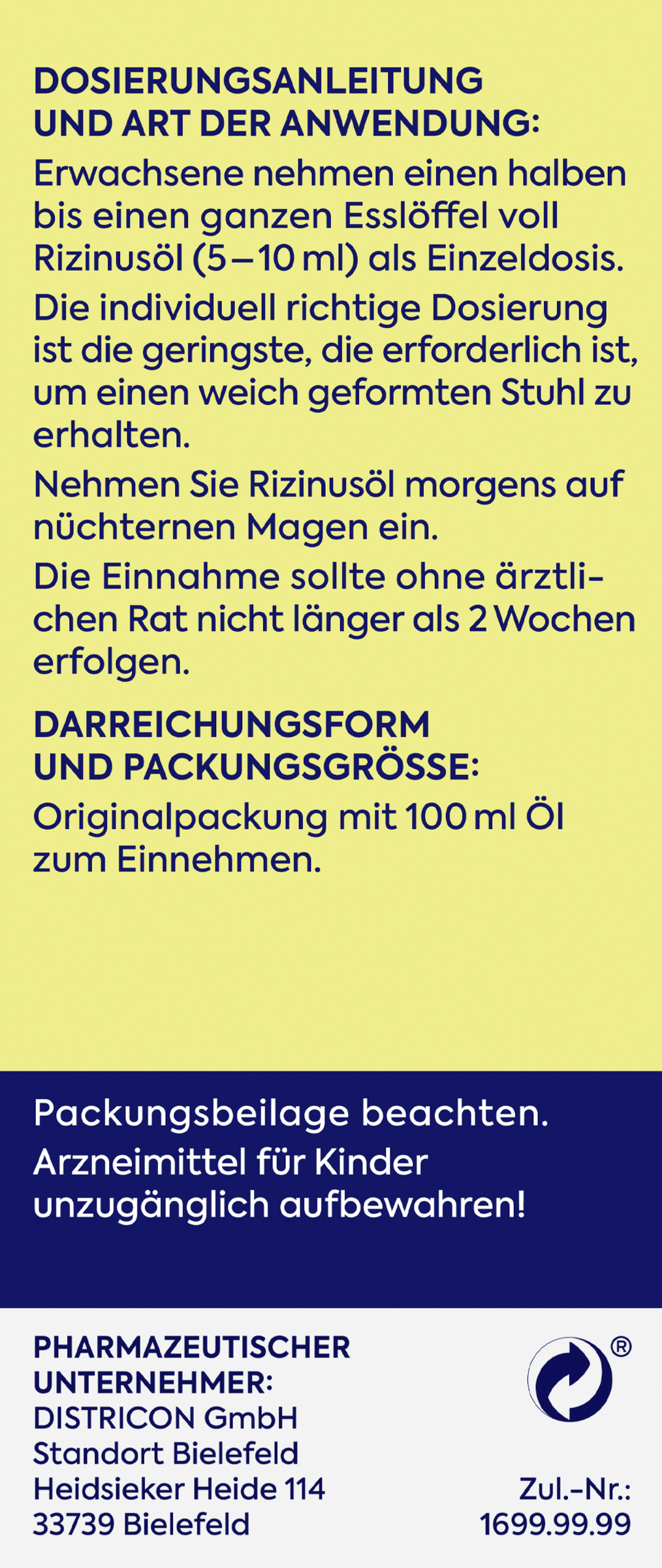 Rizinusöl sollte ohne ärztlichen Rat nicht länger als 2 Wochen eingenommen werden.