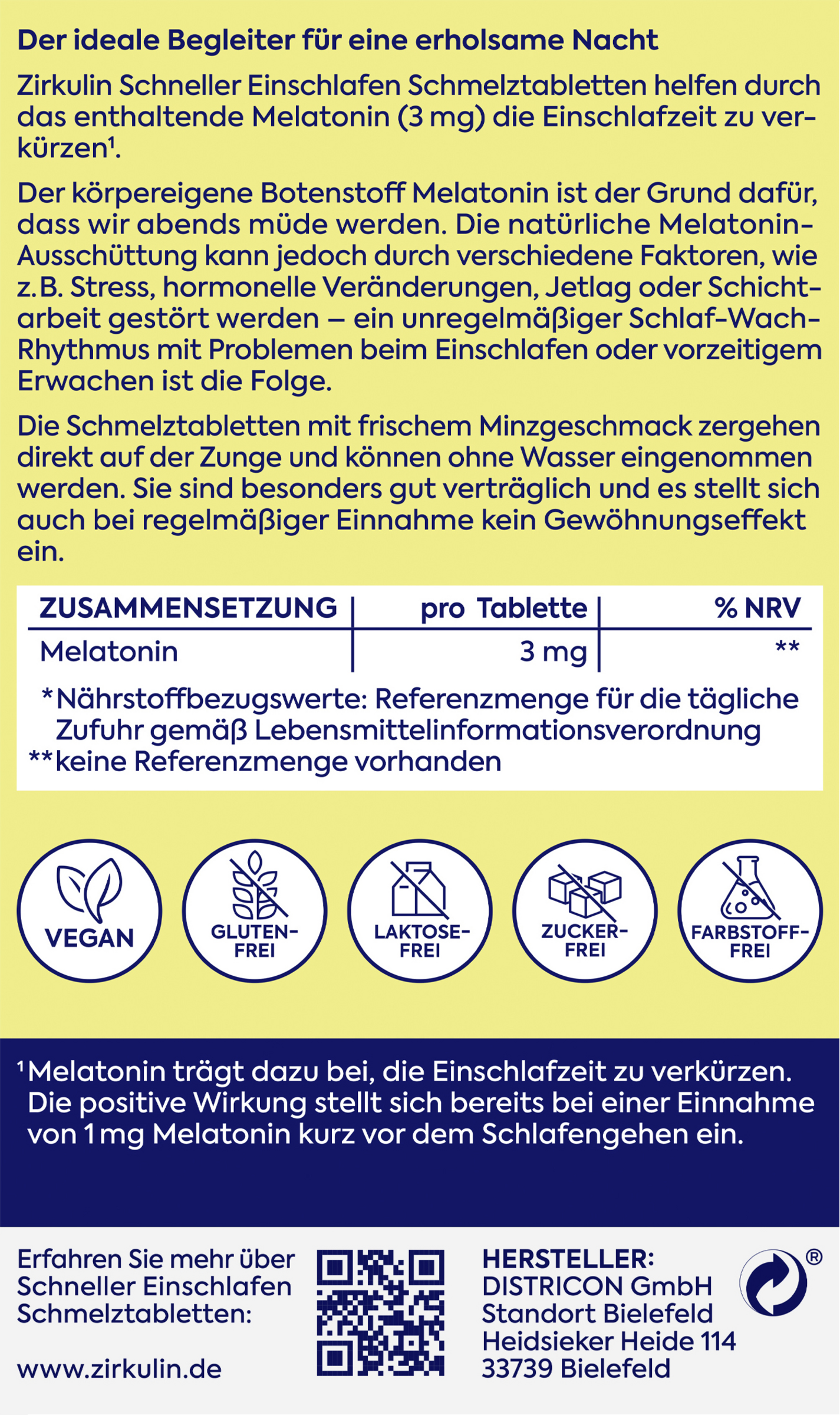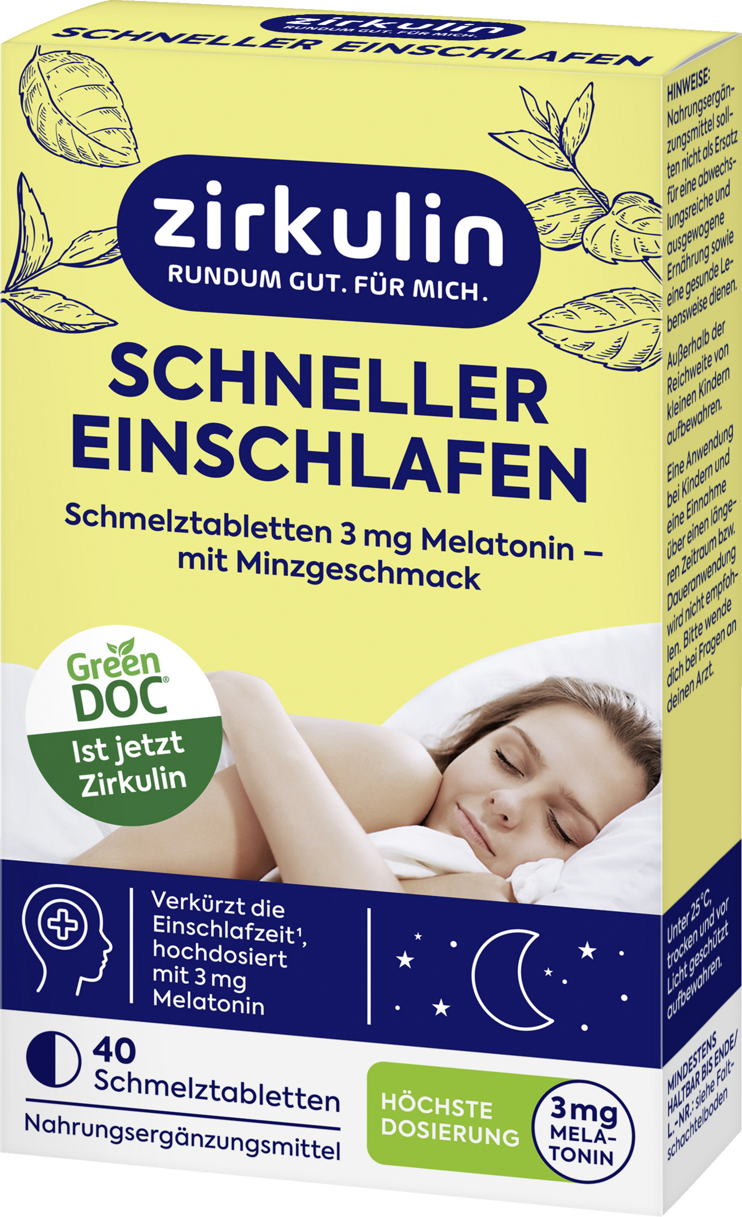 Zirkulin Schneller Einschlafen Schmelztabletten helfen durch das enthaltende Melatonin (3 mg) die Einschlafzeit zu verkürzen*.