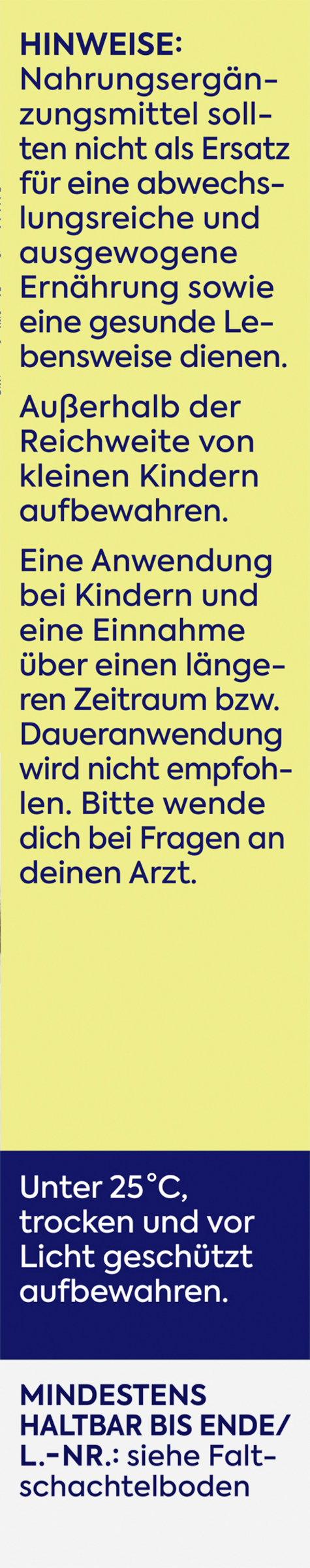 Außerhalb der Reichweite von kleinen Kindern aufbewahren. Unter 25 °C, trocken und vor Licht geschützt aufbewahren.