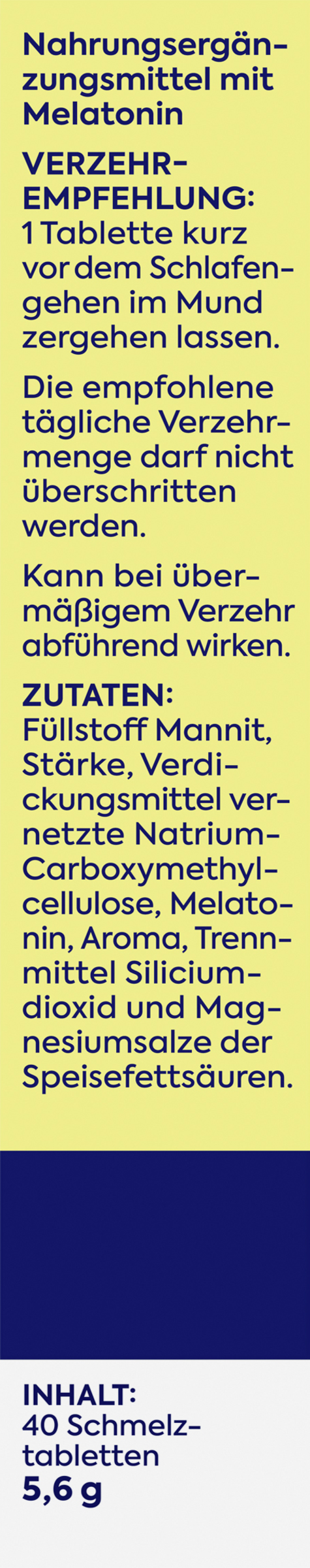 Füllstoff Mannit, Stärke, Verdickungsmittel vernetzte Natrium-Carboxymethylcellulose, Melatonin, Aroma, Trennmittel Siliciumdioxid und Magnesiumsalze der Speisefettsäuren.