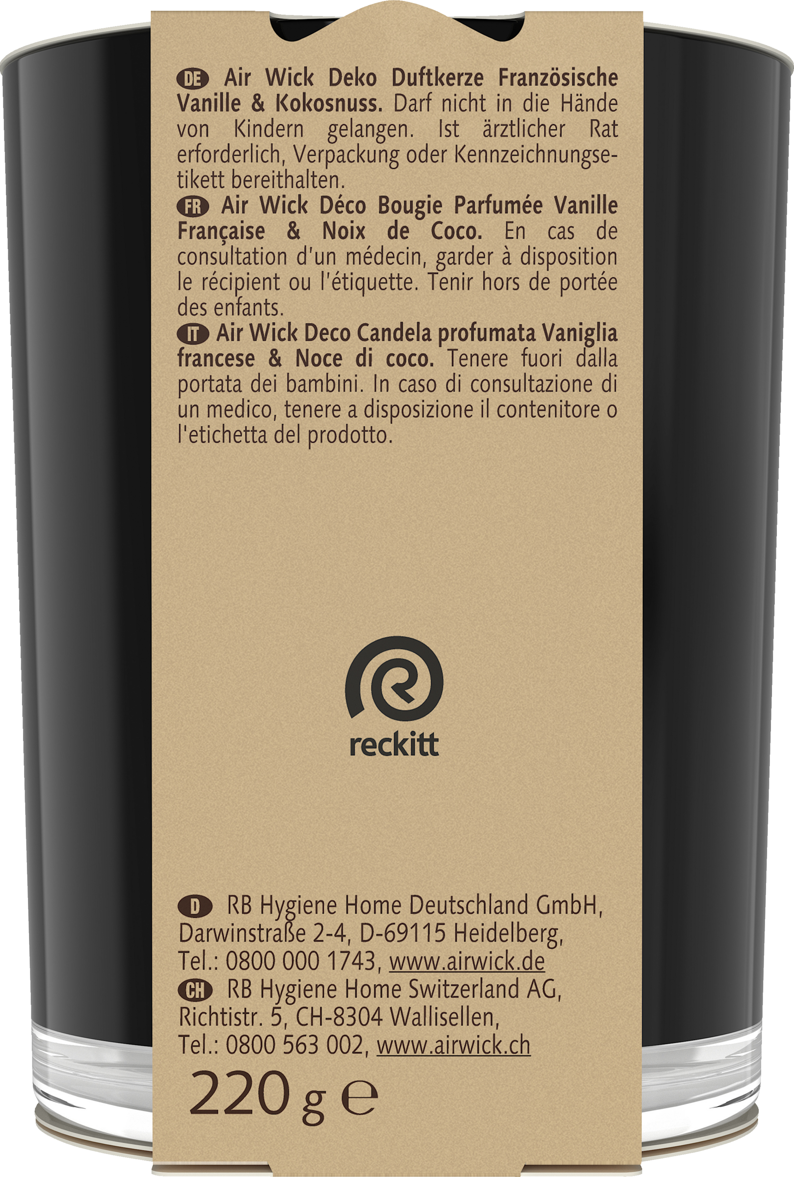 Air Wick Deko Duftkerze Französische Vanille & Kokosnuss - mit Noten von exotischer Vanilleschote und süßer Kokosnuss. Premium Deko-Duftkerze mit ätherischen Ölen & 100% bleichfreiem Docht aus Baumwolle. Wunderbarer Duft vom ersten bis zum letzten Anzünden. Elegantes, schwarzes Glas im hochwertigem Design. Ein fein abgestimmter Duft, der bis zu 40 Stunden anhält.