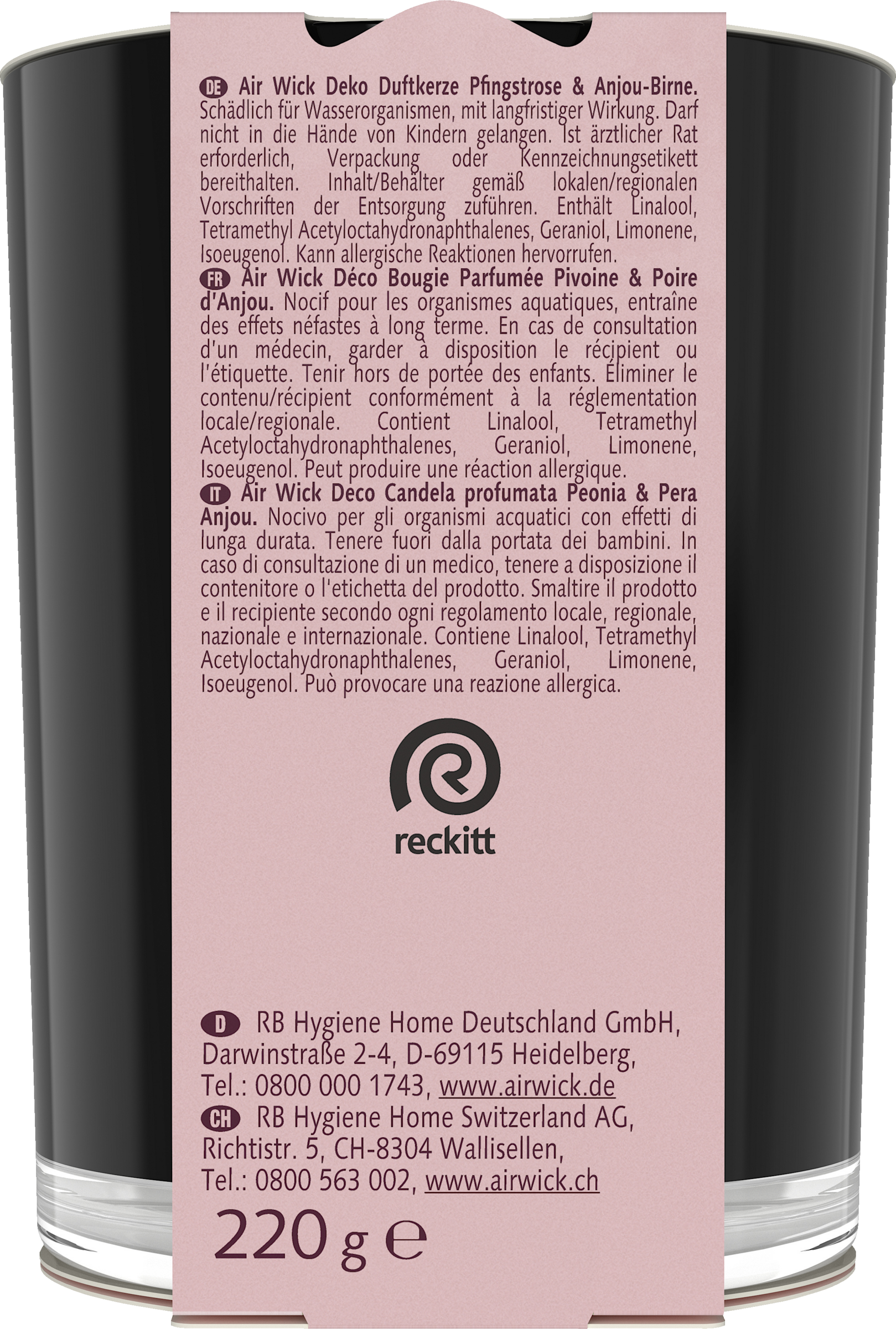 Ein angenehmer Duft mit der fruchtig-frischen Note der Anjou-Birne gepaart mit dem floralen Duft der Pfingstrose sorgt für ein besonderes Dufterlebnis. Premium Deko-Duftkerze mit ätherischen Ölen & 100% bleichfreiem Docht aus Baumwolle. Wunderbarer Duft vom ersten bis zum letzten Anzünden. Elegantes, schwarzes Glas im hochwertigem Design. Ein fein abgestimmter Duft, der bis zu 40 Stunden anhält.