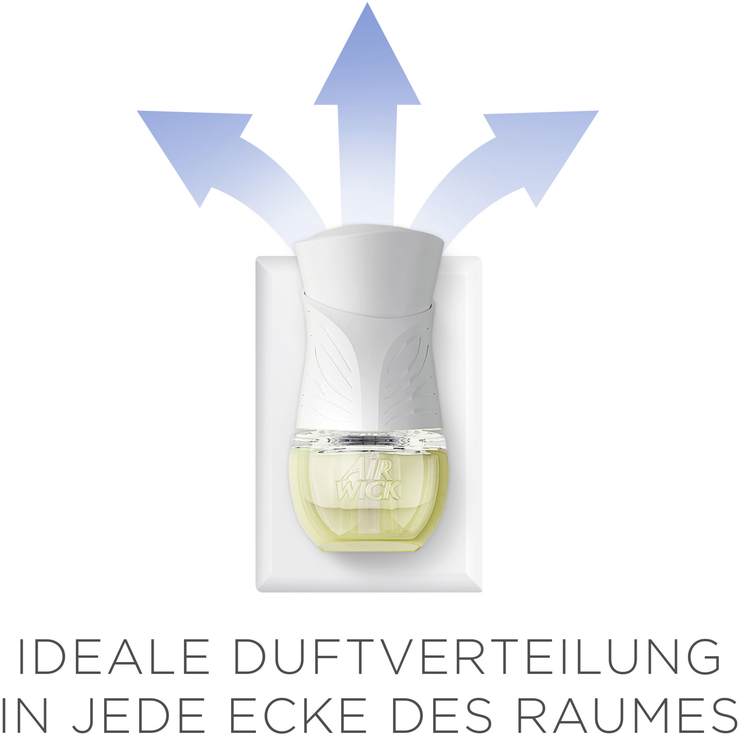 Lesen Sie die Gebrauchs- und Sicherheitshinweise vor der Anwendung durch und bewahren Sie diese auf. Für den Duftölflakon-Austausch, Gerät immer aus der Steckdose nehmen. Das Gerät darf keinen harten Stößen ausgesetzt werden. Nur im Innenbereich verwenden. Gerät und Duftölflakon stets aufrecht halten. Gerät nicht mit feuchten Händen oder metallischen Objekten berühren, nicht in der Nähe einer Hitzequelle oder in direktem Sonnenlicht platzieren und nicht auf lackierten, polierten oder Oberflächen aus Kunststoff platzieren. Weder den Luftstrom des Geräts blockieren bzw. behindern, noch in kleinen, begrenzten Haustier-Arealen ohne ausreichende Belüftung, noch kontinuierlich verwenden. Gerät über Nacht vom Strom nehmen. Nur mit Air Wick Geräten benutzen. Nur zur Verwendung durch Erwachsene. Personen, die auf Duftstoffe empfindlich reagieren, sollten dieses Produkt mit Vorsicht verwenden. Raumdüfte sind kein Ersatz für gute Haushaltshygiene. Kann allergische Reaktionen hervorrufen.