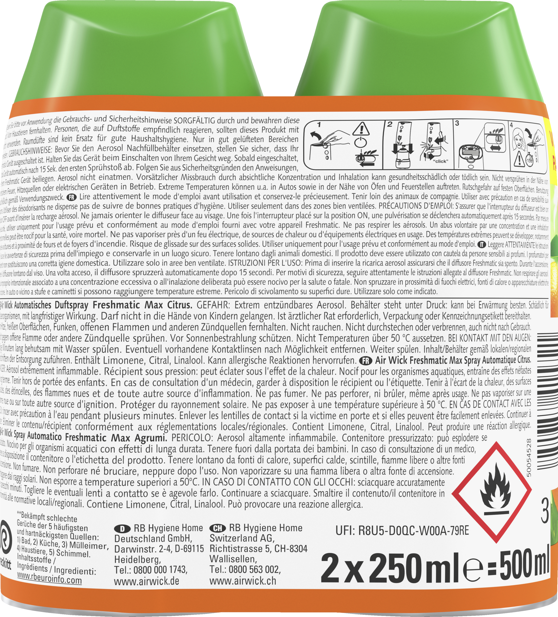 Extrem entzündbares Aerosol. Behälter steht unter Druck: kann bei Erwärmung bersten. Schädlich für Wasserorganismen, mit langfristiger Wirkung. DARF NICHT IN DIE HÄNDE VON KINDERN GELANGEN. Ist ärztlicher Rat erforderlich, Verpackung oder Kennzeichnungsetikett bereithalten. Von Hitze, heißen Oberflächen, Funken, offenen Flammen und anderen Zündquellen fernhalten. Nicht rauchen. Nicht durchstechen oder verbrennen, auch nicht nach Gebrauch. Nicht gegen offene Flamme oder andere Zündquelle sprühen. BEI KONTAKT MIT DEN AUGEN: Einige Minuten lang behutsam mit Wasser spülen. Eventuell vorhandene Kontaktlinsen nach Möglichkeit entfernen. Weiter spülen. Aerosol nicht einatmen. Vorsätzlicher Missbrauch durch absichtliche Konzentration und Inhalation kann gesundheitsschädlich oder tödlich sein. Nicht versprühen in der Nähe von elektrischem Feuer, Hitzequellen oder elektrischen Geräten in Betrieb. Extreme Temperaturen können u.a. in Autos sowie in der Nähe von Öfen und Feuerstellen auftreten. Rutschgefahr auf festen Oberflächen. Benutzung ausschließlich gemäß Verwendungszweck. Inhalt/Behälter gemäß lokalen/regionalen Vorschriften der Entsorgung zuführen Enthält Limonene, Citral, Linalool. Kann allergische Reaktionen hervorrufen.