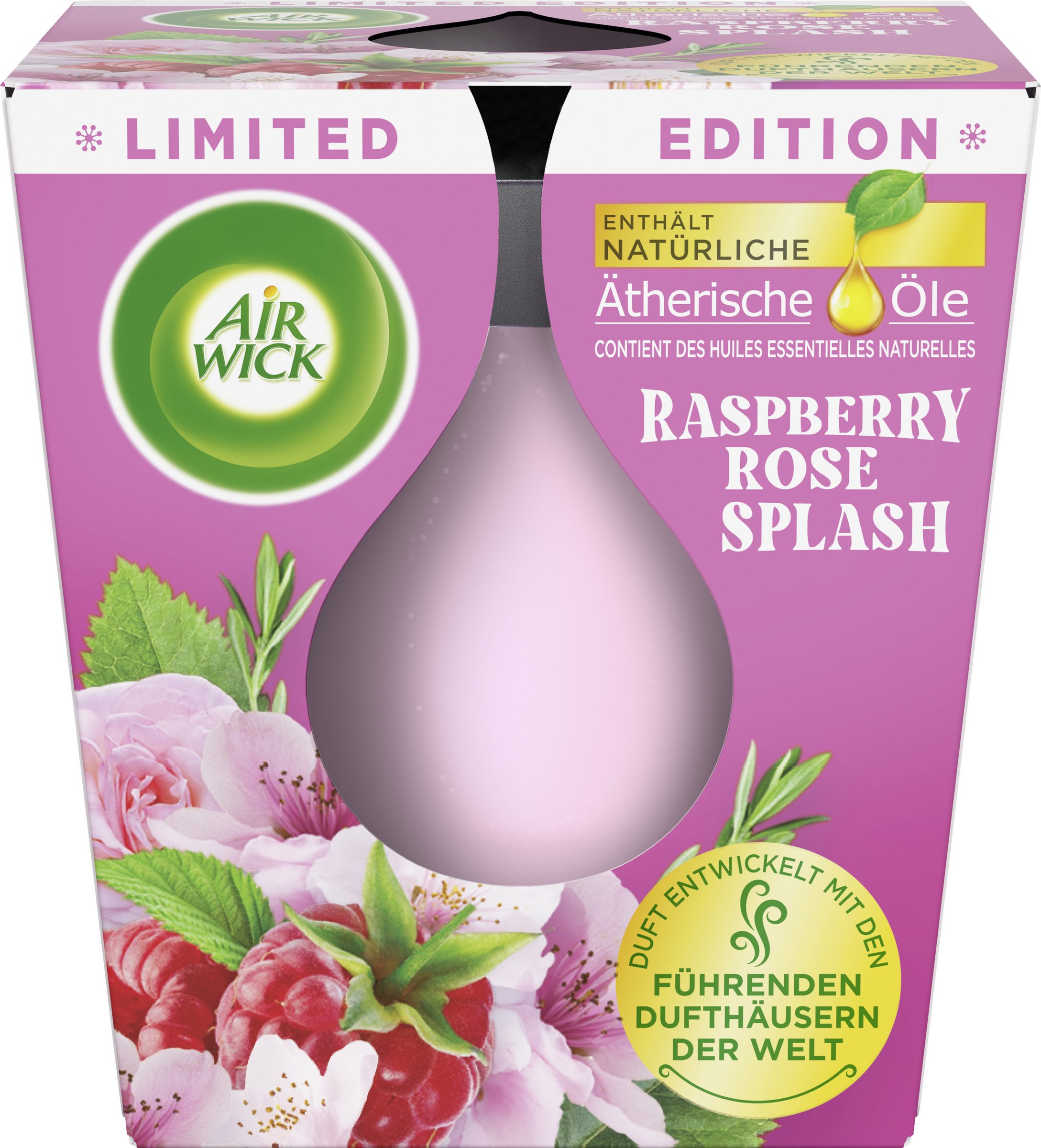 Air Wick Wohlfühl-Duftkerze Raspberry Rose Splash - Dieser angenehme Duft von fruchtigen Himbeeren und Rose bringt die Verspieltheit der Natur in Ihr Zuhause.