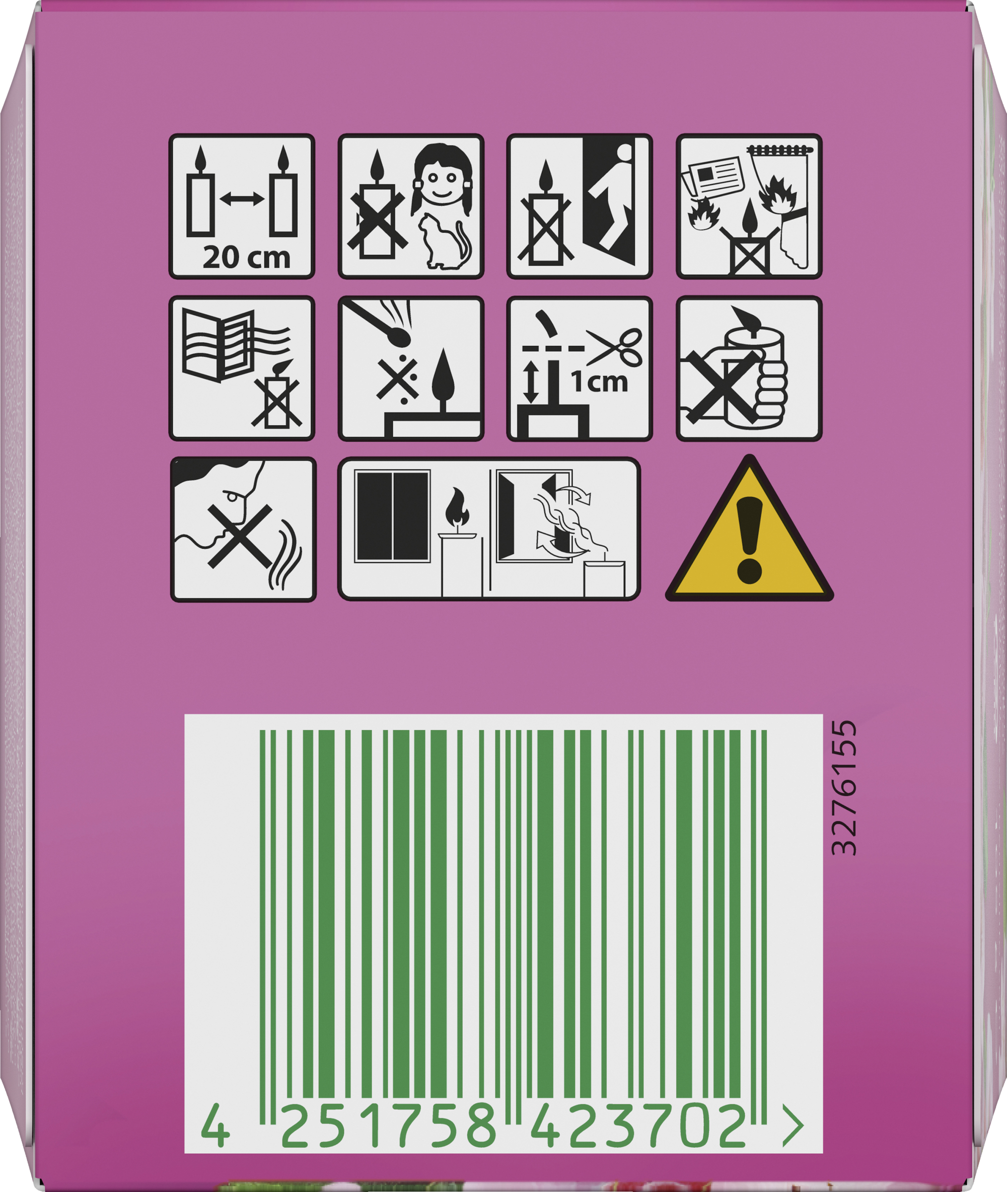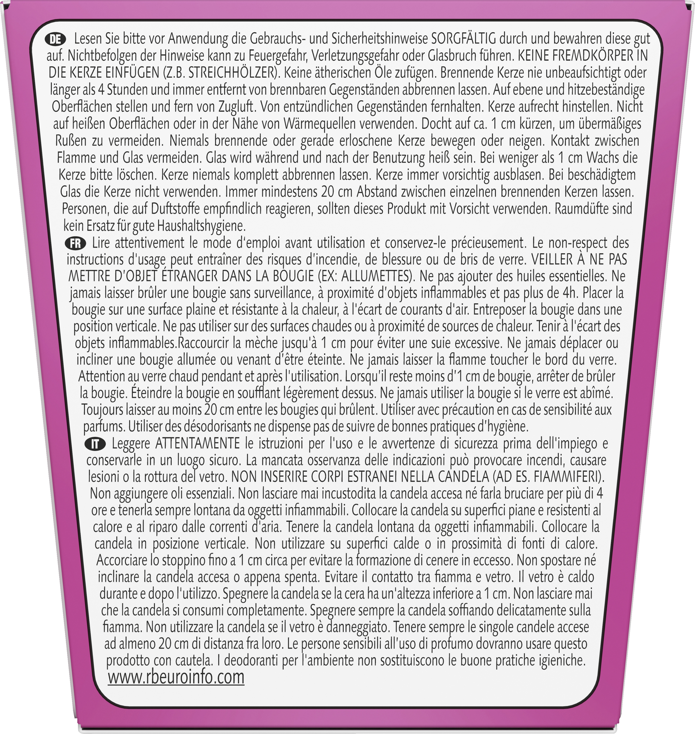 Lesen Sie bitte vor Anwendung die Gebrauchs- und Sicherheitshinweise SORGFÄLTIG durch und bewahren diese gut auf. Nichtbefolgen der Hinweise kann zu Feuergefahr, Verletzungsgefahr oder Glasbruch führen. KEINE FREMDKÖRPER IN DIE KERZE EINFÜGEN (Z.B. STREICHHÖLZER). Keine ätherischen Öle zufügen. Brennende Kerze nie unbeaufsichtigt oder länger als 4 Stunden und immer entfernt von brennbaren Gegenständen abbrennen lassen. Auf ebene und hitzebeständige Oberflächen stellen und fern von Zugluft. Von entzündlichen Gegenständen fernhalten. Kerze aufrecht hinstellen. Nicht auf heißen Oberflächen oder in der Nähe von Wärmequellen verwenden. Docht auf ca. 1 cm kürzen, um übermäßiges Rußen zu vermeiden. Niemals brennende oder gerade erloschene Kerze bewegen oder neigen. Kontakt zwischen Flamme und Glas vermeiden. Glas wird während und nach der Benutzung heiß sein. Bei weniger als 1 cm Wachs die Kerze bitte löschen. Kerze niemals komplett abbrennen lassen. Kerze immer vorsichtig ausblasen. Bei beschädigtem Glas die Kerze nicht verwenden. Immer mindestens 20 cm Abstand zwischen einzelnen brennenden Kerzen lassen. Personen, die auf Duftstoffe empfindlich reagieren, sollten dieses Produkt mit Vorsicht verwenden. Raumdüfte sind kein Ersatz für gute Haushaltshygiene. www.rbeuroinfo.com