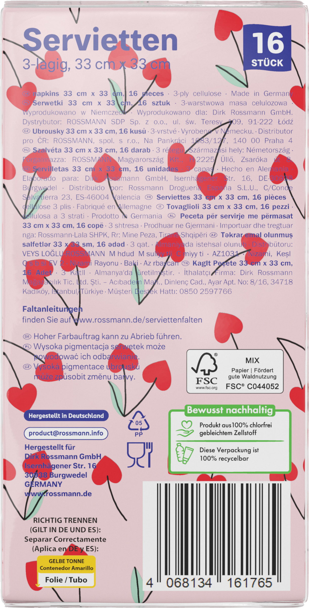 Unsere alouette Servietten eignen sich perfekt für besondere Anlässe und den täglichen Gebrauch. Dabei sind sie die perfekte Wahl, um Ihren Esstisch zu verschönern. Die 3-lagigen Servietten aus extra feinem Tissue bieten höchste Qualität und sind besonders weich und reißfest.•Motiv: Herzkirschen•3-lagig•extra feines Tissue•ca. 33 x 33 cmHinweis: Faltanleitungen finden Sie auf www.rossmann.de/serviettenfalten