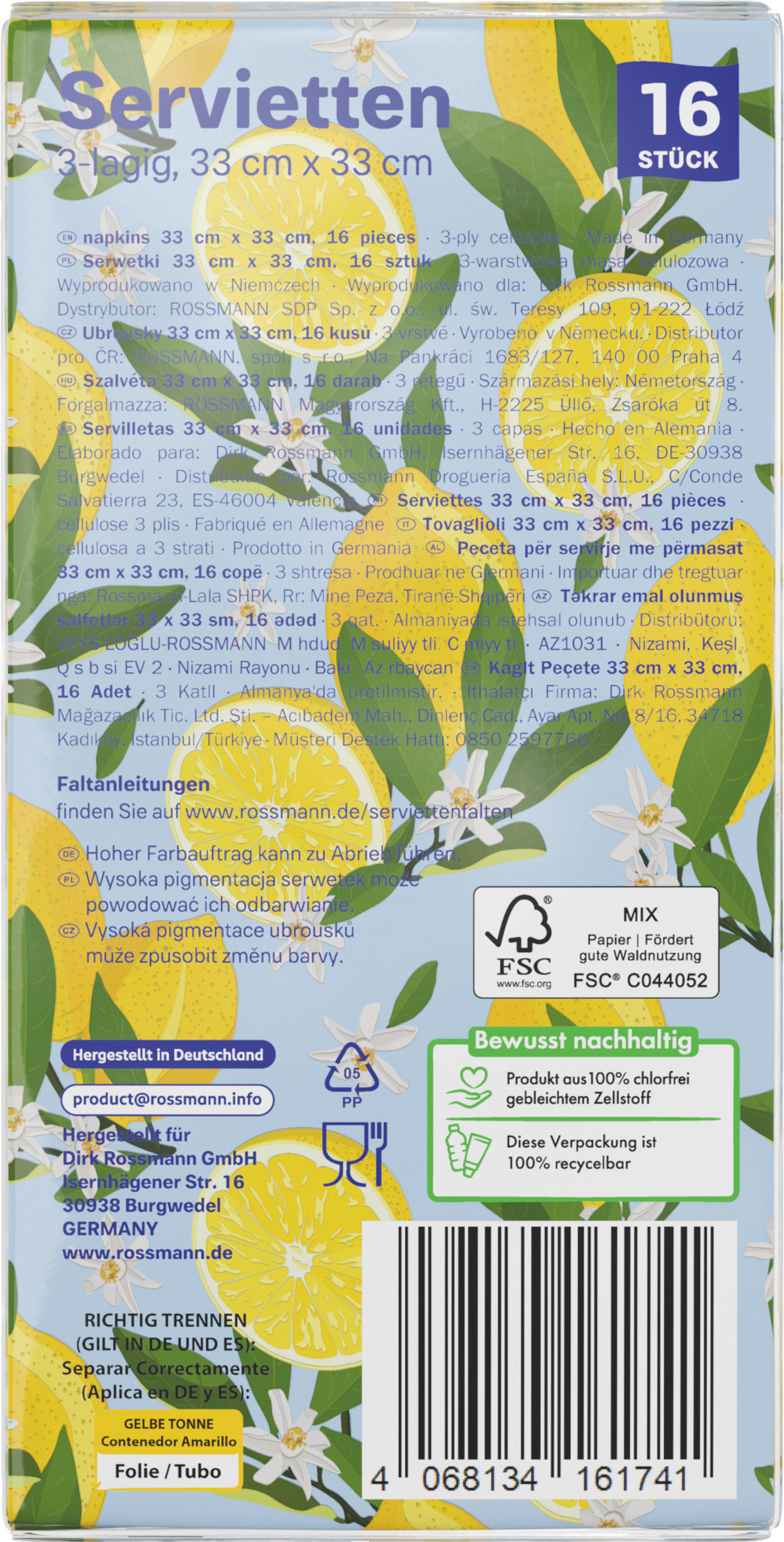 Unsere alouette Servietten eignen sich perfekt für besondere Anlässe und den täglichen Gebrauch. Dabei sind sie die perfekte Wahl, um Ihren Esstisch zu verschönern. Die 3-lagigen Servietten aus extra feinem Tissue bieten höchste Qualität und sind besonders weich und reißfest.•Motiv: Zitronen•3-lagig•extra feines Tissue•ca. 33 x 33 cmHinweis: Faltanleitungen finden Sie auf www.rossmann.de/serviettenfalten