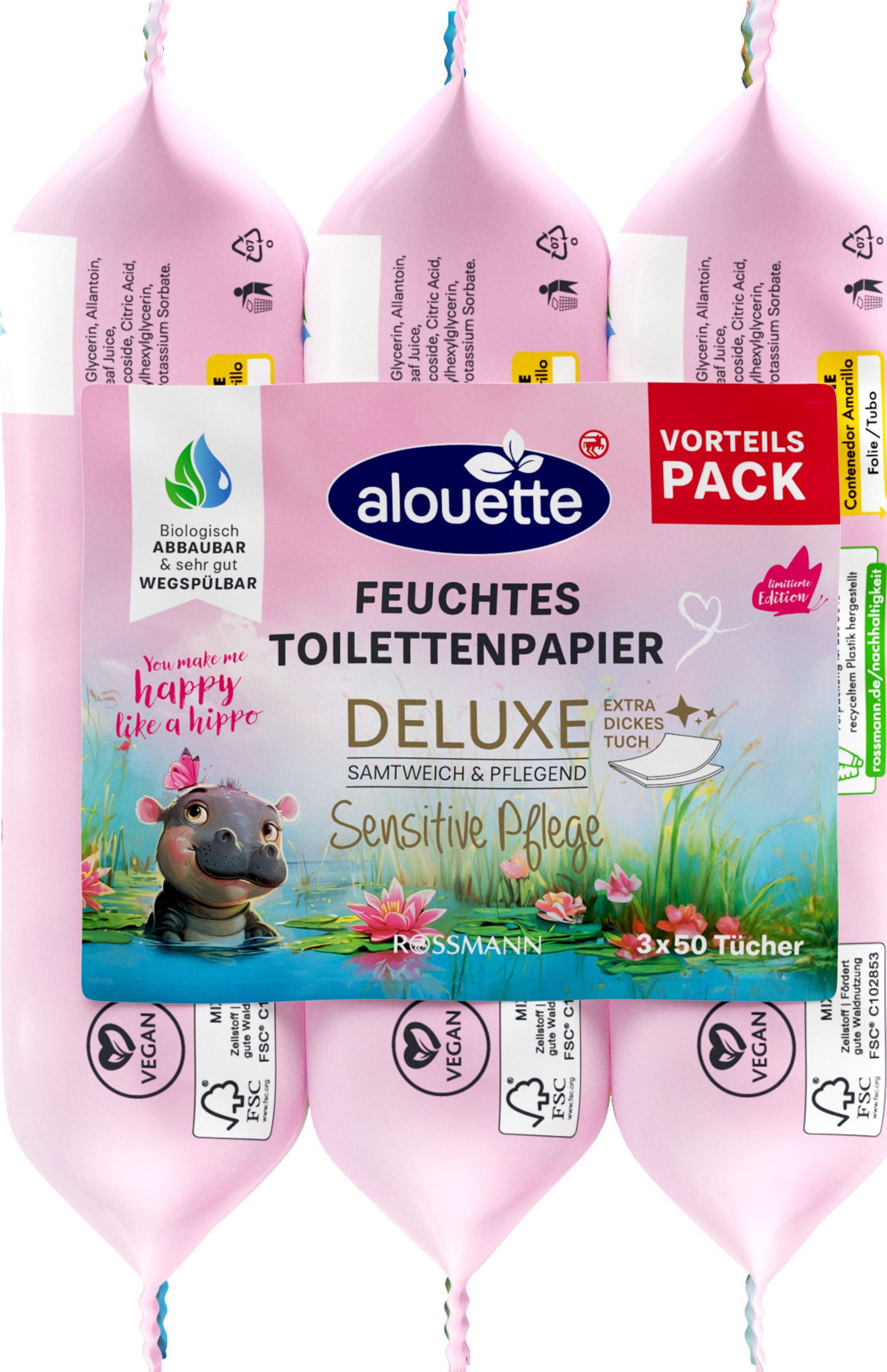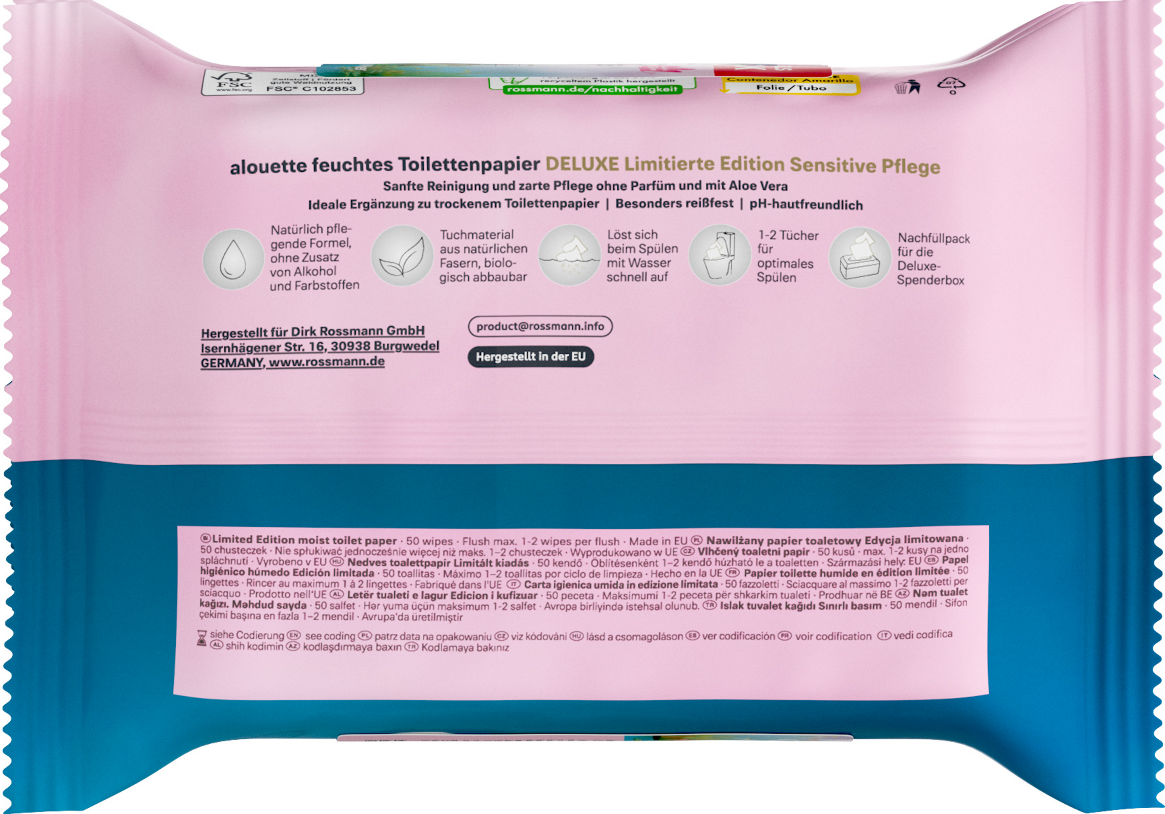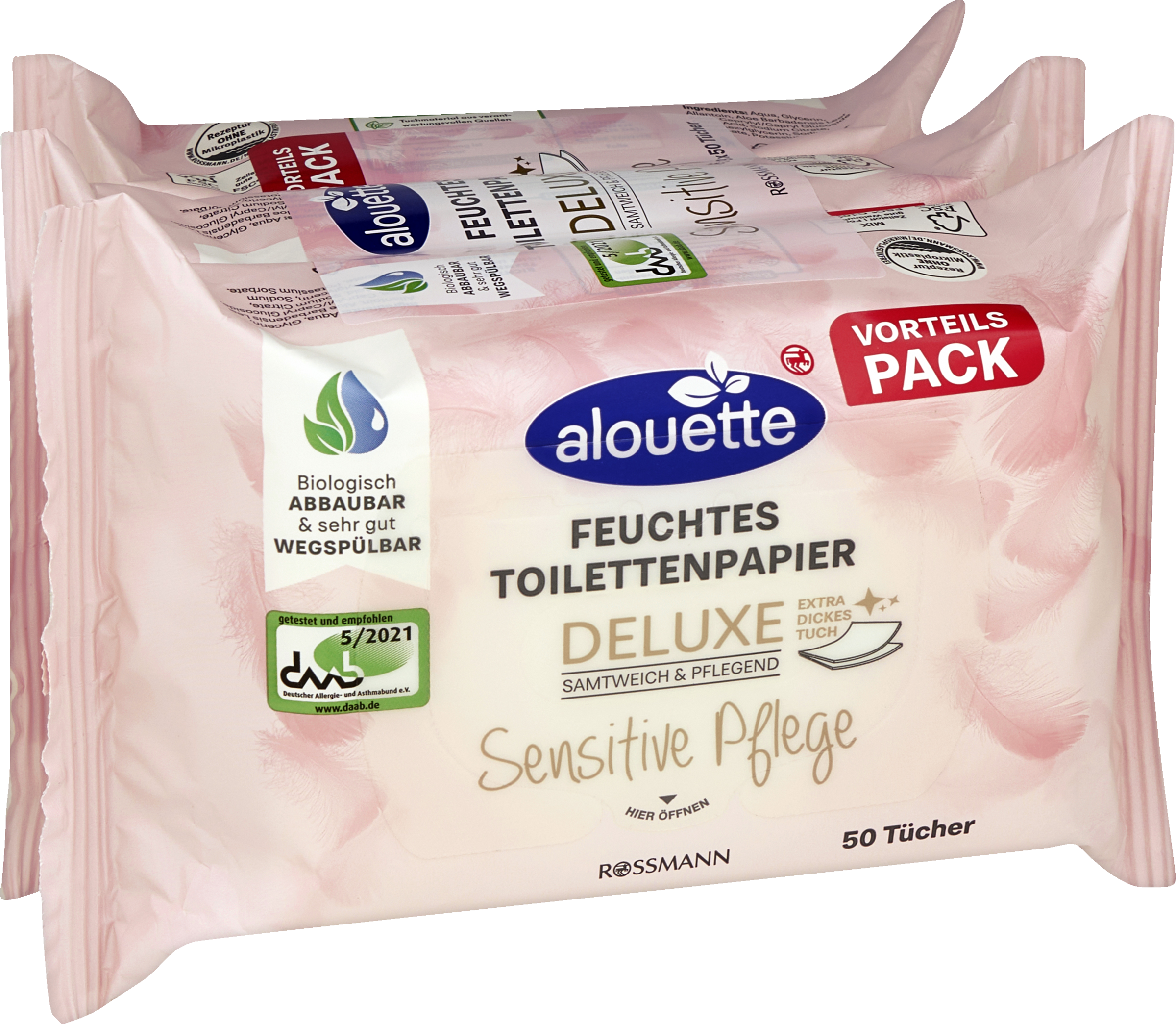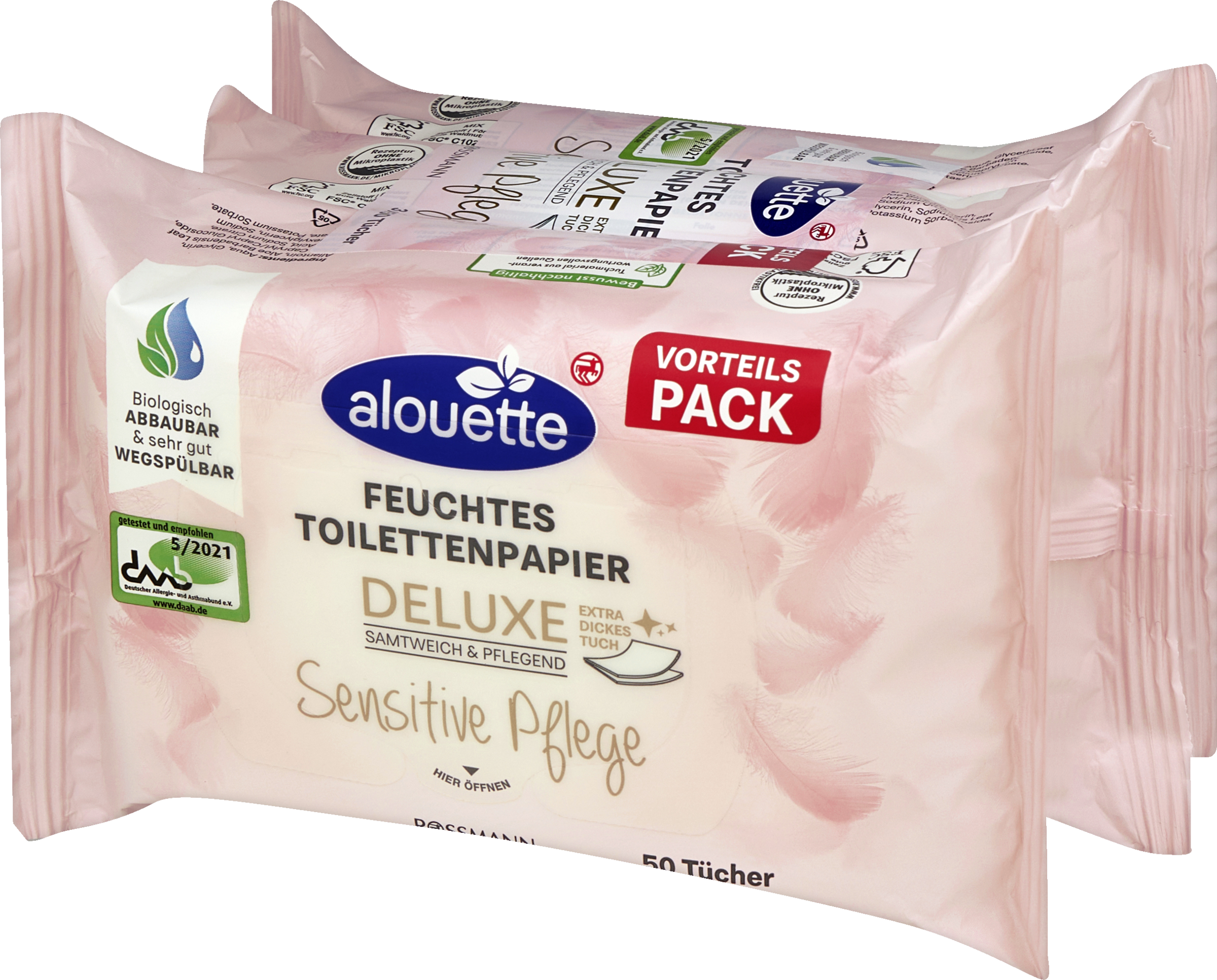 Ideale Ergänzung zu trockenem Toilettenpapier. Die alouette feuchten Toilettentücher sensitiv bieten mit den biologisch abbaubaren Tüchern eine besonders hochwertige Qualität. Durch die spezielle Faserzusammensetzung ohne chemische Binder und Kunststoffanteile sind die Tücher nicht nur sehr gut wegspülbar, sondern darüber hinaus auch angenehm weich. Die besonders großen Tücher sind aufgrund der milden Reinigungsformel auch für sensible Haut geeignet. Dank der extra dicken Tücher sind sie zudem besonders reißfest.