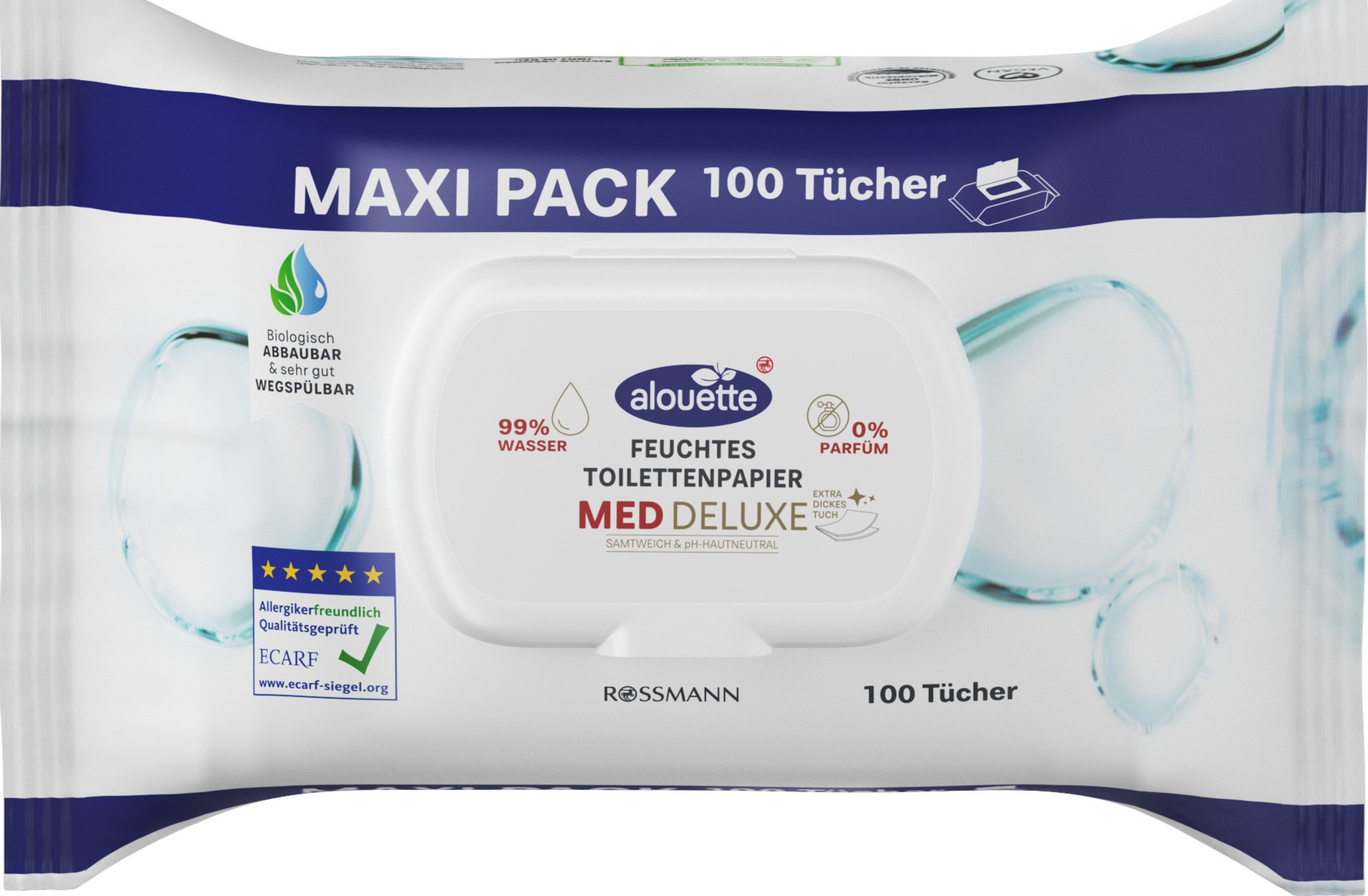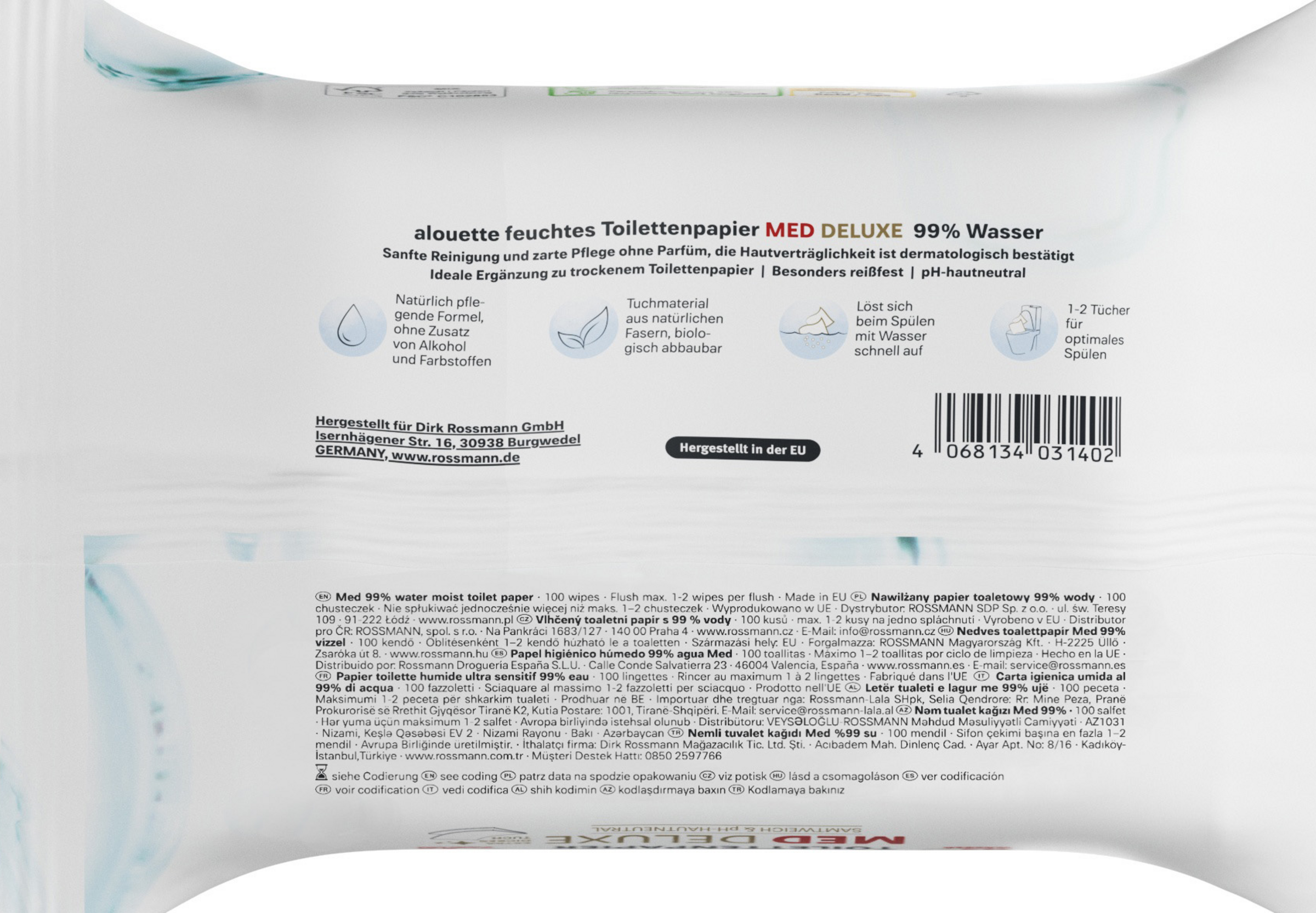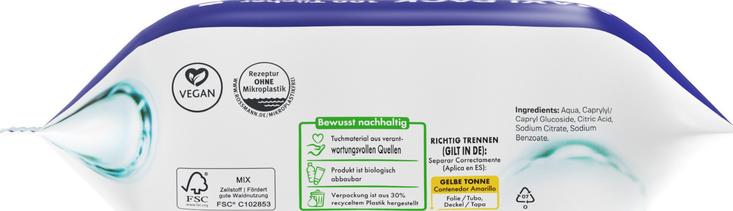 Sanfte Reinigung und zarte Pflege ohne Parfüm, die Hautverträglichkeit ist dermatologisch bestätigt. Natürlich pflegende Formel, ohne Zusatz von Alkohol und Farbstoffen, Tuchmaterial aus natürlichen Fasern, biologisch abbaubar.