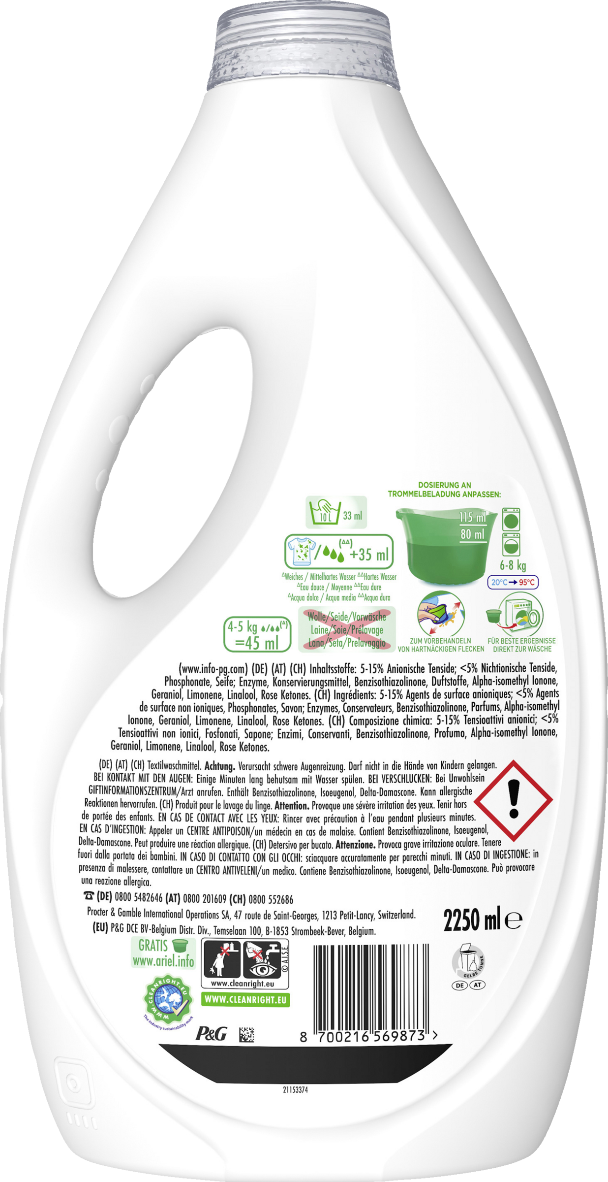 Entdecken Sie Ariel, die Nr. 1 der meist empfohlenen Waschmittelmarken von führenden Waschmaschinen-Herstellern in Deutschland (Bauknecht, SIEMENS, BOSCH, AEG) mit Ariel Color+ Flüssigwaschmittel. Kraftvolle Fleckenentfernung schon ab der 1. Waschladung. Seine Formel wurde speziell für Kaltwasserzyklen entwickelt und löst Flecken selbst in kaltem Wasser. Zudem können sie Ariel Color+ Flüssigwaschmittel mithilfe der Dosierkappe zur Vorbehandlung von Flecken verwenden, bevor Sie Ihre Kleidung in die Trommel geben.