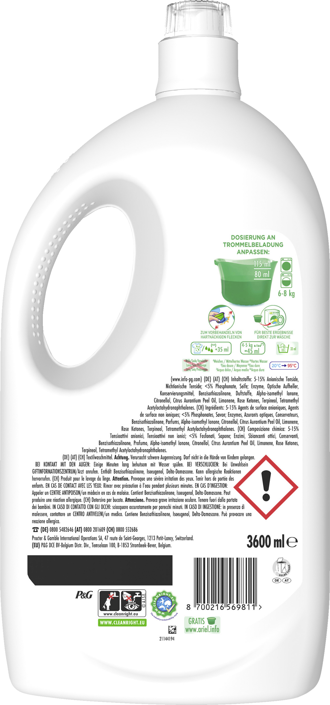 Entdecken Sie Ariel, die Nr. 1 der meist empfohlenen Waschmittelmarken von führenden Waschmaschinen-Herstellern in Deutschland mit Ariel Universal+ Flüssigwaschmittel. Kraftvolle Fleckenentfernung schon ab der 1. Waschladung. Seine Formel wurde speziell für Kaltwäsche entwickelt und löst Flecken selbst in kalten Waschzyklen. Zudem können Sie Ariel Universal+ Flüssigwaschmittel mithilfe der grünen Dosierkappe zur Vorbehandlung von Flecken verwenden, bevor Sie Ihre Kleidung in die Trommel geben. Für optimale Ergebnisse füllen Sie die grüne Dosierkappe entsprechend dem Füllstand der Trommel mit Ariel Flüssigwaschmittel und legen Sie sie in die Trommel auf die Wäsche. Aus Gründen des Umweltschutzes sind nicht alle Flaschen mit einer Dosierkappe ausgestattet. Diese ist kostenlos über die Webseite ariel.info erhältlich.