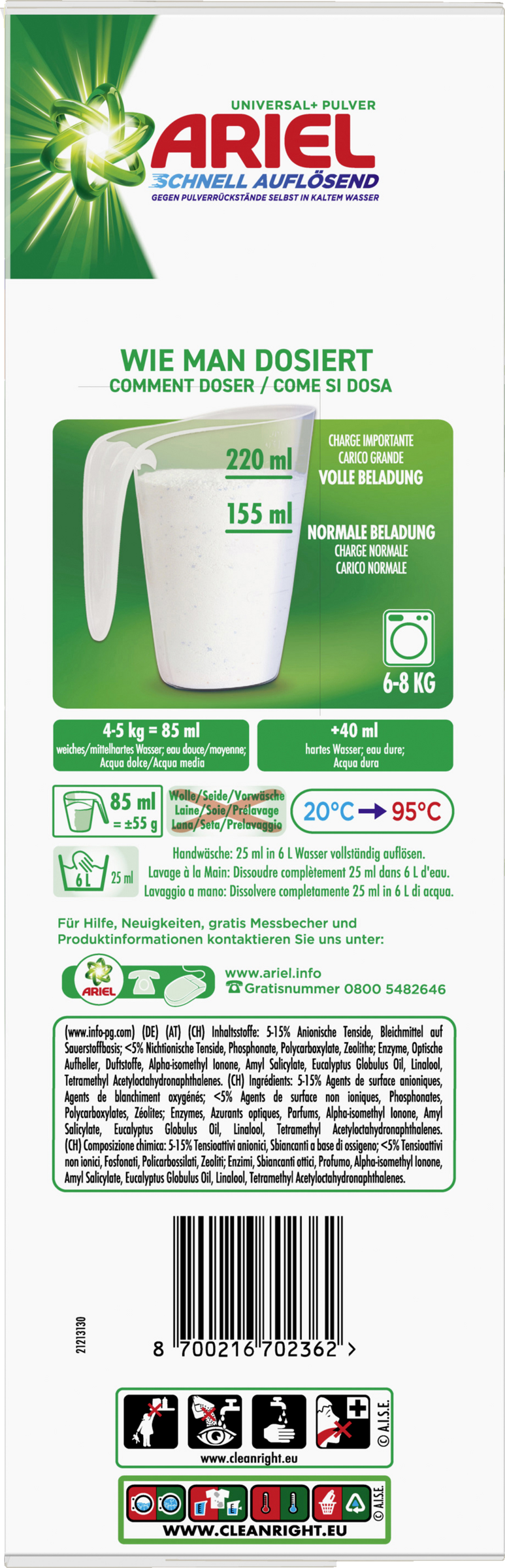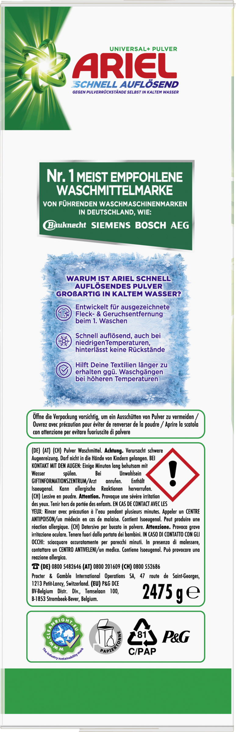 Entdecken Sie Ariel, die Nr. 1 der empfohlenen Marken von führenden Waschmaschinen-Herstellern in Deutschland wie: Bauknecht, SIEMENS, BOSCH, AEG empfehlen Ariel Schnell Auflösendes Universal+ Pulverwaschmittel als Waschmittel. Kraftvolle Fleckenentfernung schon ab der 1. Waschladung. Darüber hinaus ist es so konzipiert, dass es sich dank seiner einzigartigen Anti-Rückstands-Technologie auch bei Kaltwasserzyklen optimal und schnell auflöst, ohne Rückstände zu hinterlassen. Es bietet außerdem kraftvolle Flecken- und Geruchsentfernung schon ab der 1. Waschladung. Durch Waschen bei niedrigen Temperaturen schützen Sie Ihre Wäsche im Vergleich zu Waschprogrammen bei höherer Temperatur. Das Ariel Pulverwaschmittel - für strahlende Reinheit und angenehmen Duft.