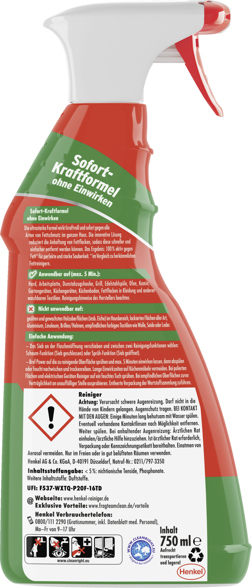 - 100 % aktiv gegen Fett und Eingebranntes – durch die innovative Formel reduziert der Fettreiniger die Anhaftung von Fettflecken, sodass diese schneller und einfacher entfernt werden können