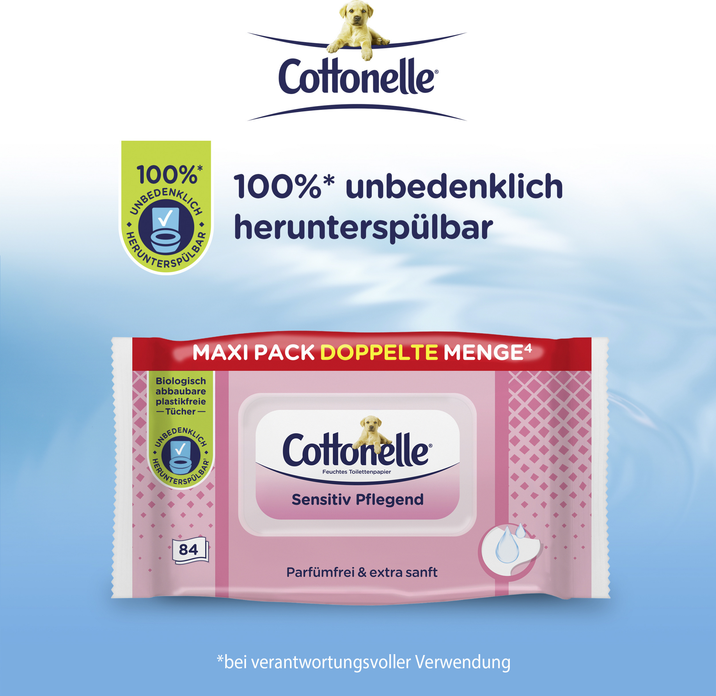 Nutzen Sie trockenes Toilettenpapier zur Vorreinigung und feuchtes Toilettenpapier zur sanften Nachreinigung. Nach der Reinigung darf Cottonelle in der Toilette heruntergespült werden. Bitte verwenden Sie für ein optimales Spülen nur ein oder zwei Tücher gleichzeitig.