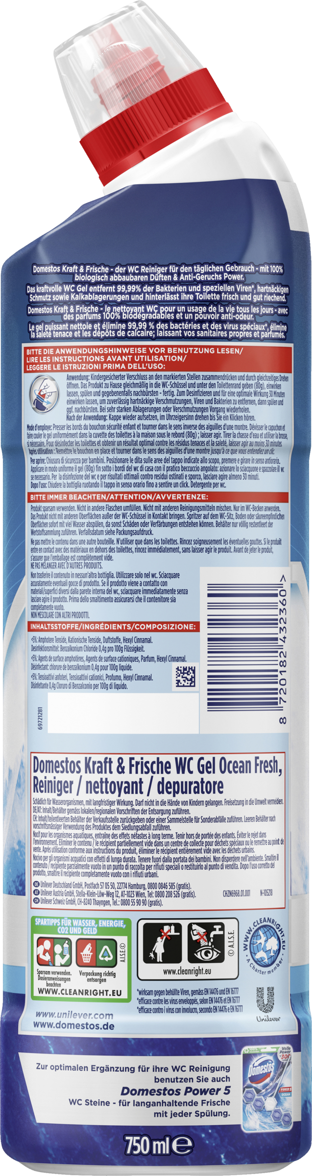 Das Domestos Kraft & Frische WC Gel Ocean Fresh ist ein WC Reiniger für den täglichen Gebrauch und sorgt für eine langanhaltende, hygienische und strahlende Sauberkeit. Das kraftvolle Reinigungsmittel entfernt 99,99% der Bakterien und spezielle Viren*, hartnäckigen Schmutz sowie Kalkablagerungen und bildet ein Schutzschild gegen die Neubildung von Kalk. Dank der dickflüssigeren Konsistenz haftet das WC Gel extra stark in der Toilette und sorgt für eine hygienische und langanhaltende Sauberkeit. Die ätherischen Öle aus Lavendel und Patschuli verleihen dem Domestos Nr. 1 WC Gel einen angenehmen Duft nach Ocean.