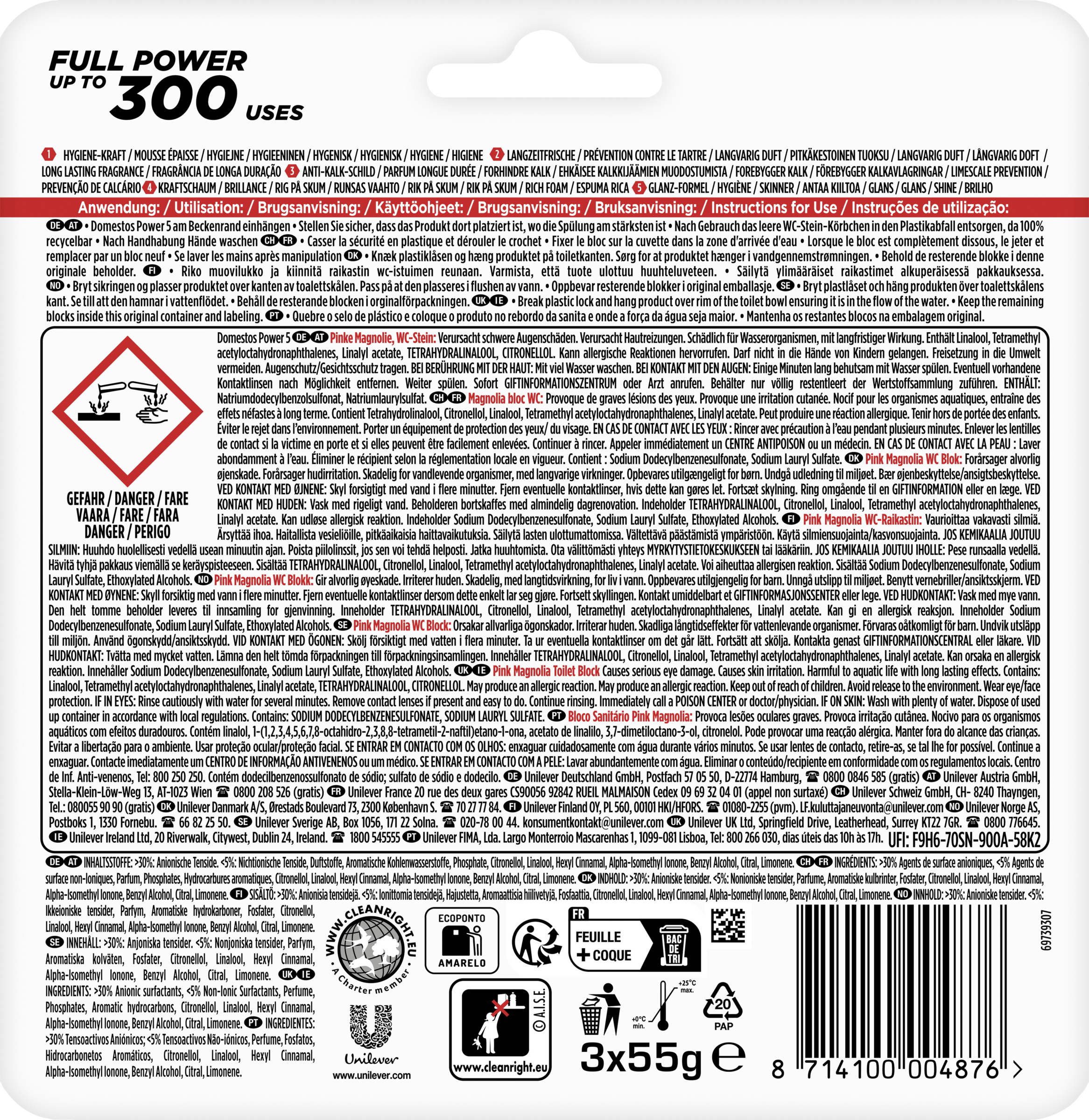 Spülung für Spülung gibt der WC-Reiniger einen reichhaltigen Schaum frei, beugt Kalkablagerungen vor und entfernt Schmutz. Volle Power – bis zu 300 Spülungen. Zudem lässt er die Toilettenschüssel strahlend sauber glänzen und sorgt für einen frischen und langanhaltenden Duft nach Magnolie im Badezimmer. Mit dem zu 100% recycelbaren Plastikkörbchen ist der Domestos Toilettenstein eine effektive und nachhaltige Lösung für die WC-Pflege.