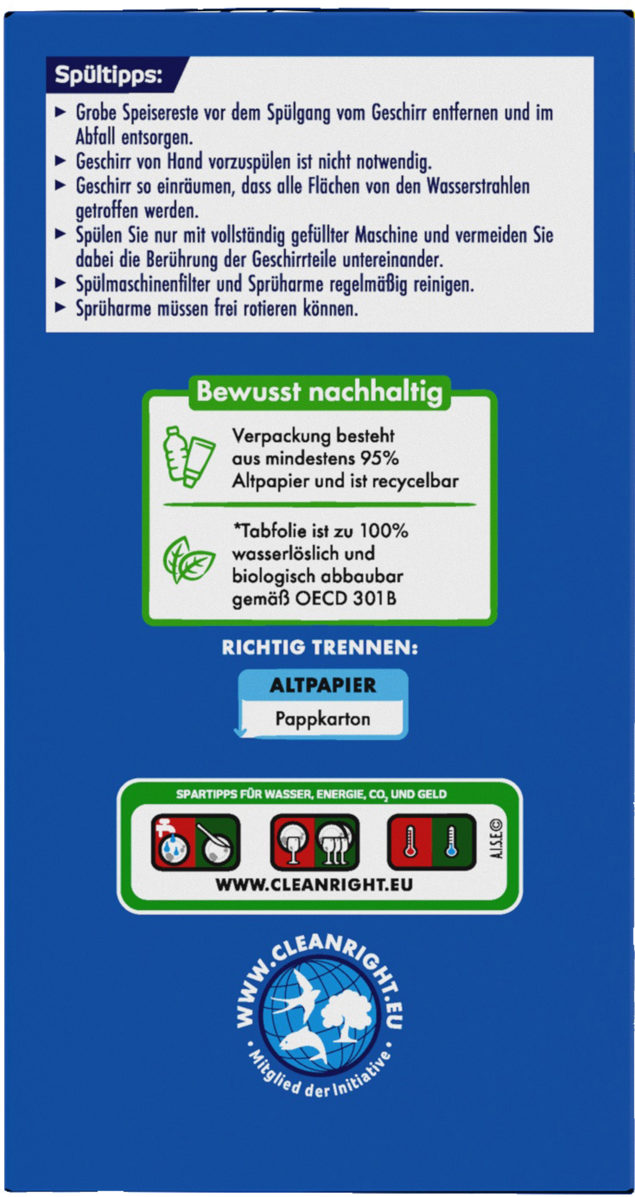 - Geben Sie 1 Tab mit wasserlöslicher Folie direkt in die Dosierkammer Ihrer Geschirrspülmaschine.