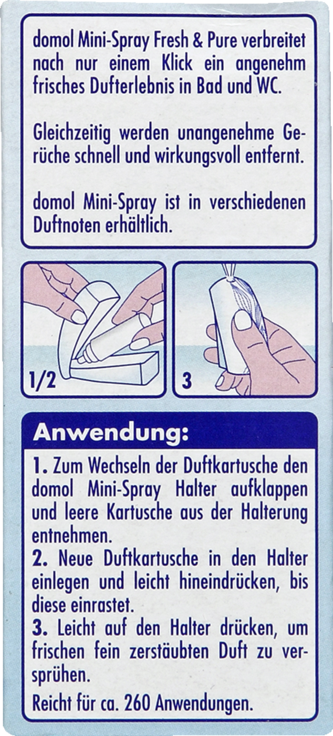 - Zum Wechseln der Duftkartusche den domol Mini-Spray Halter aufklappen und leere Kartusche aus der Halterung entnehmen.