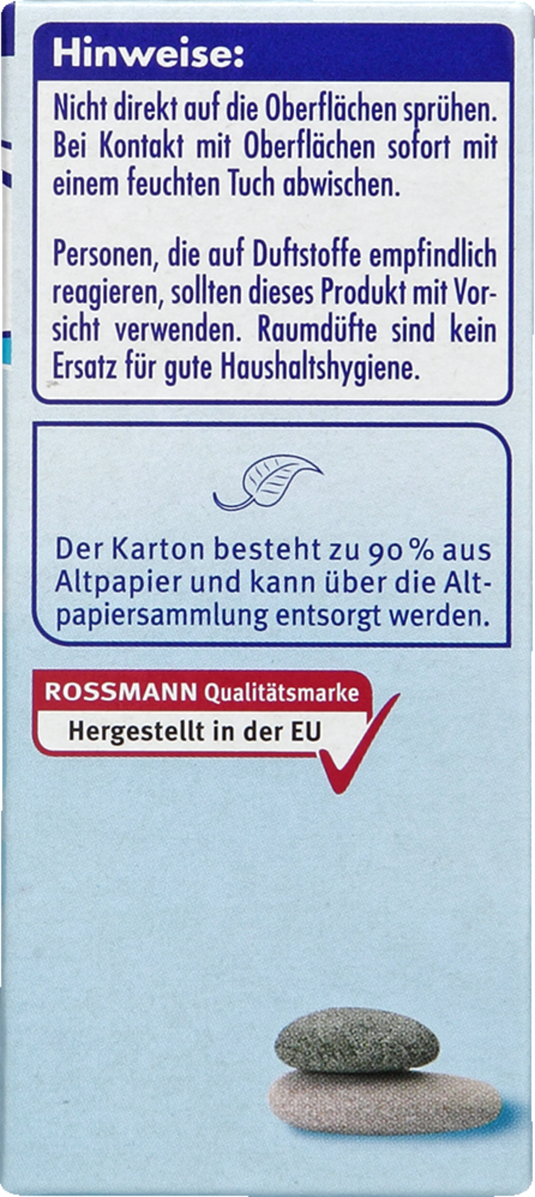 Nicht direkt auf Oberflächen sprühen. Bei Kontakt mit Oberflächen sofort mit einem feuchten Tuch abwischen. Nicht auf empfindliche Oberflächen kleben. Personen, die auf Duftstoffe empfindlich reagieren, sollten dieses Produkt mit Vorsicht verwenden. Raumdüfte sind kein Ersatz für gute Haushaltshygiene.