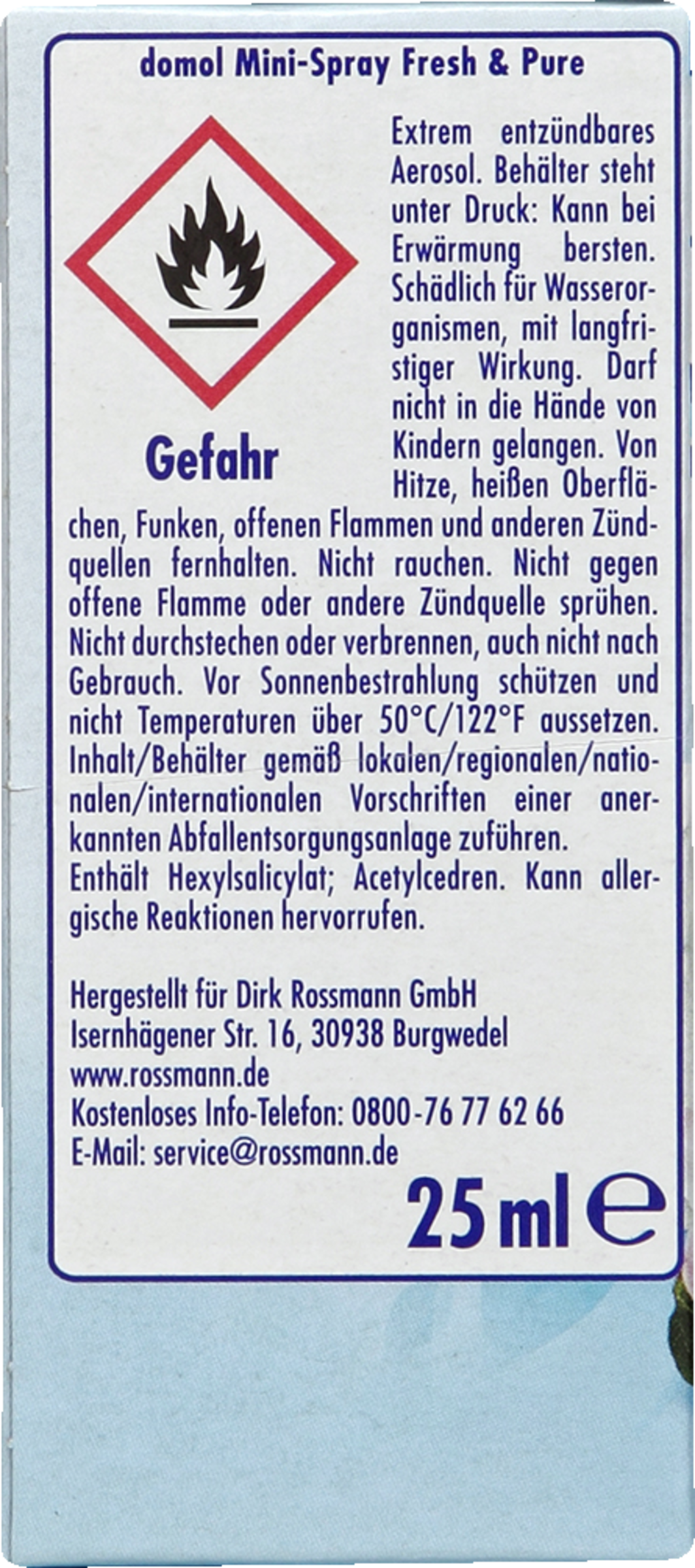 Extrem entzündbares Aerosol. Behälter steht unter Druck: Kann bei Erwärmung bersten. Schädlich für Wasserorganismen, mit langfristiger Wirkung. Darf nicht in die Hände von Kindern gelangen. Von Hitze, heißen Oberflächen, Funken, offenen Flammen und anderen Zündquellen fernhalten. Nicht rauchen. Nicht gegen offene Flamme oder andere Zündquelle sprühen. Nicht durchstechen oder verbrennen, auch nicht nach Gebrauch. Vor Sonnenbestrahlung schützen und nicht Temperaturen über 50 °C/122 °F aussetzen. Inhalt/Behälter gemäß lokalen/ regionalen/nationalen/internationalen Vorschriften einer anerkannten Abfallentsorgungsanlage zuführen. Enthält Hexylsalicylat; Acetylcedren. Kann allergische Reaktionen hervorrufen.