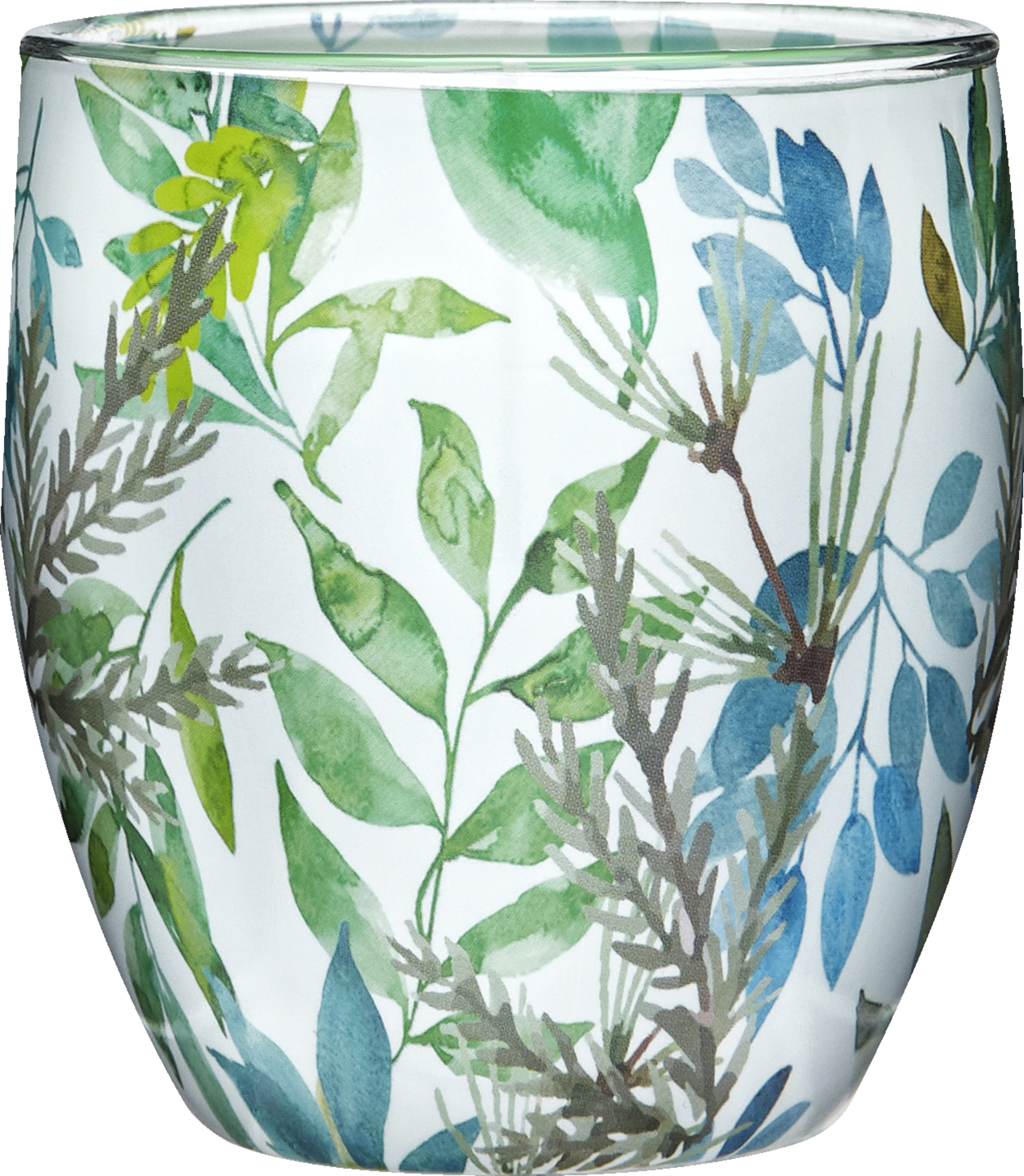 - klassische Duftkerze im Glas mit dekorativem Sleevedesign
