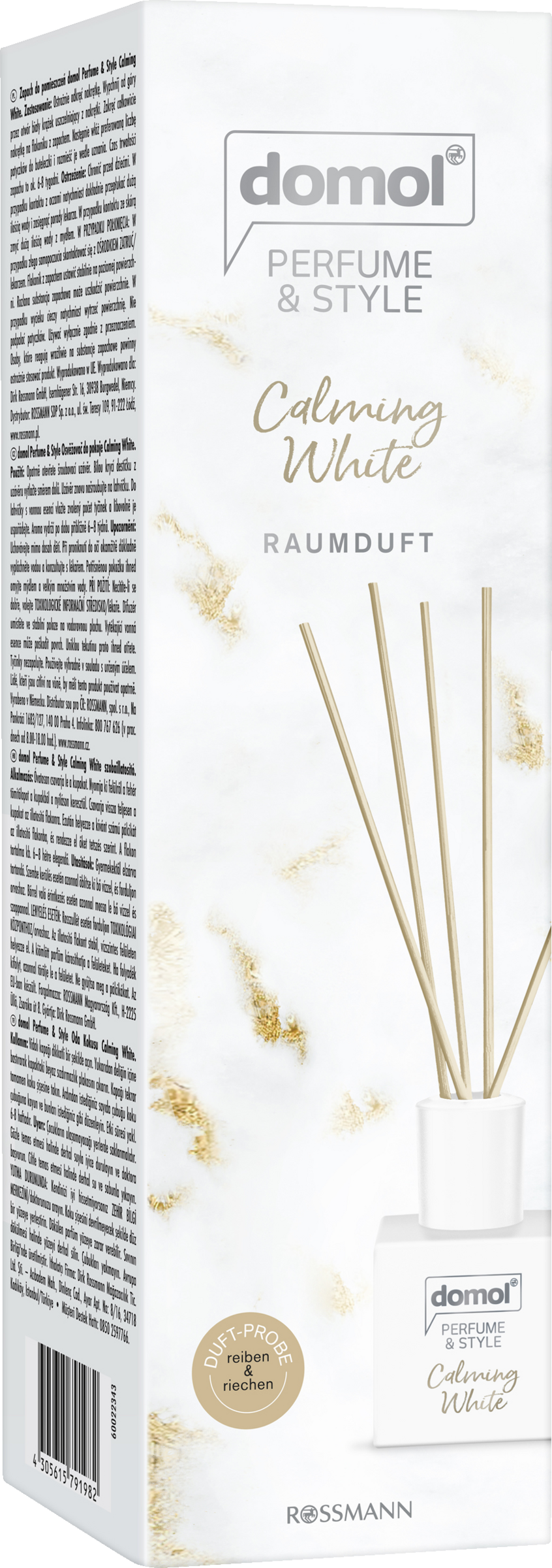 Freuen Sie sich auf magische Duftmomente in Ihrem Zuhause - mit dem domol Perfume & Style Raumduft Calming White. Das Geheimnis der Düfte liegt in den Emotionen, die sie in uns wecken. Genießen Sie eine sinnliche Atmosphäre mit dem Duft von Cotton, kombiniert mit zarten fruchtigen Facetten der Apfelblüte und frischen pudrigen Noten weißer Blumen. Die stilvolle Kombination aus Duftflakon, Stäbchen und hochwertigen Aromen kann im gesamten Wohnraum eingesetzt werden und verleiht Ihren Räumen wochenlang eine frische Note.