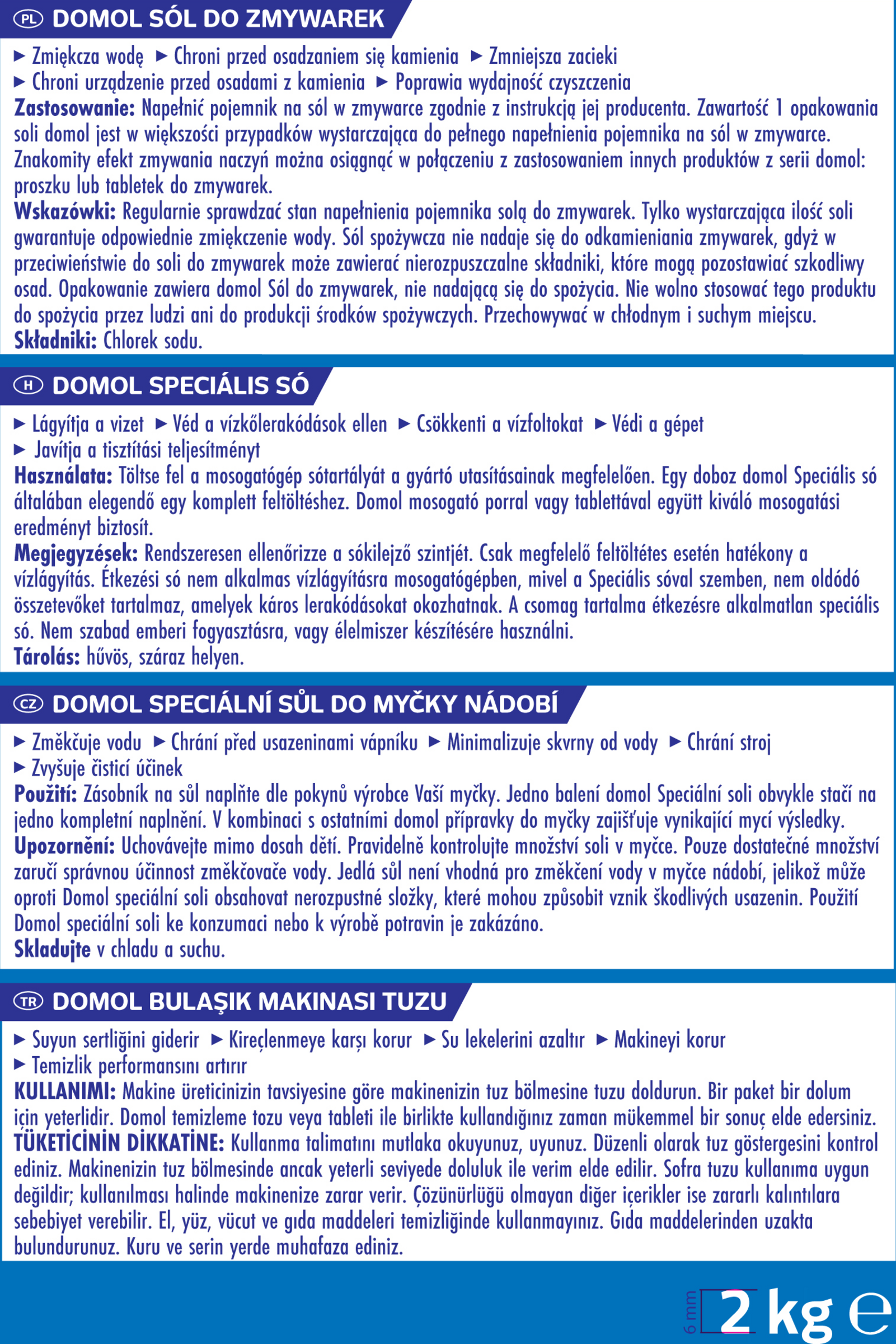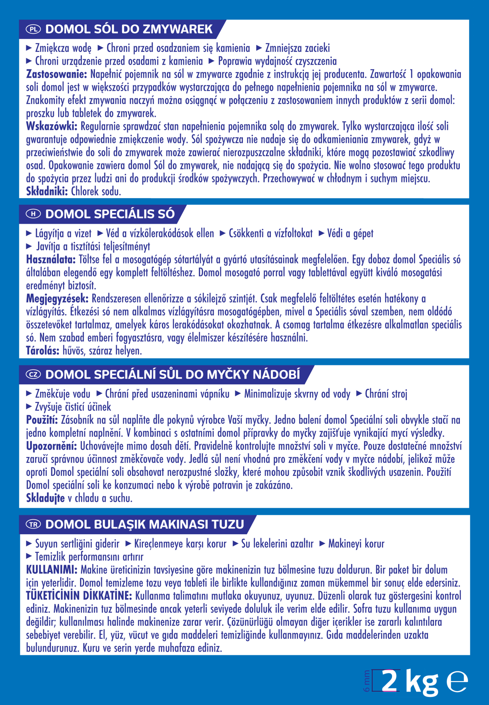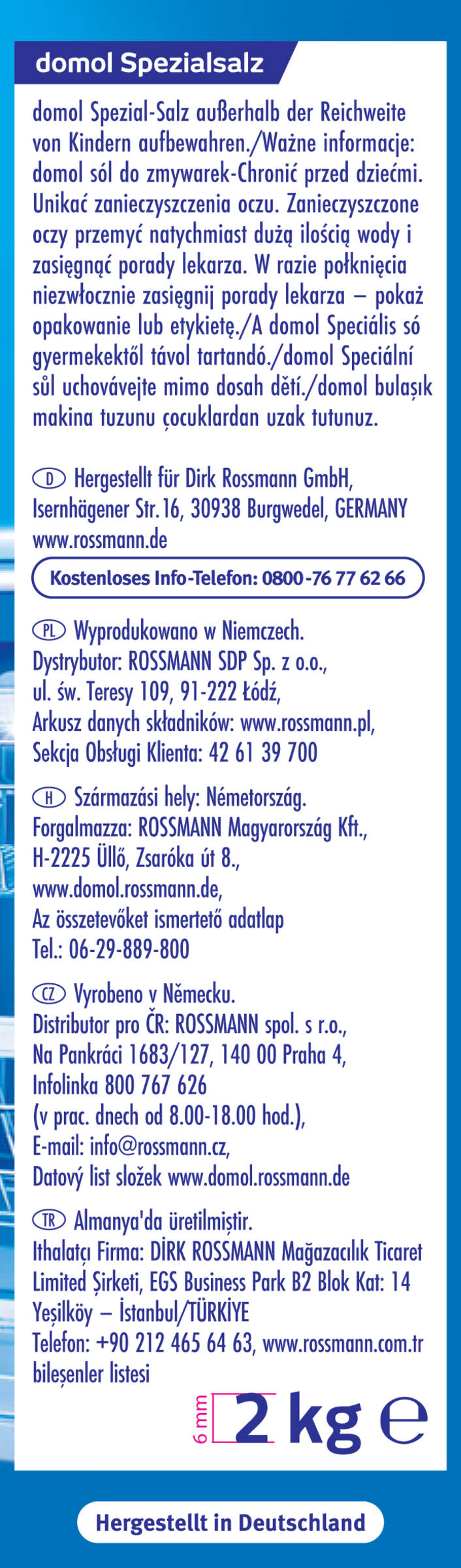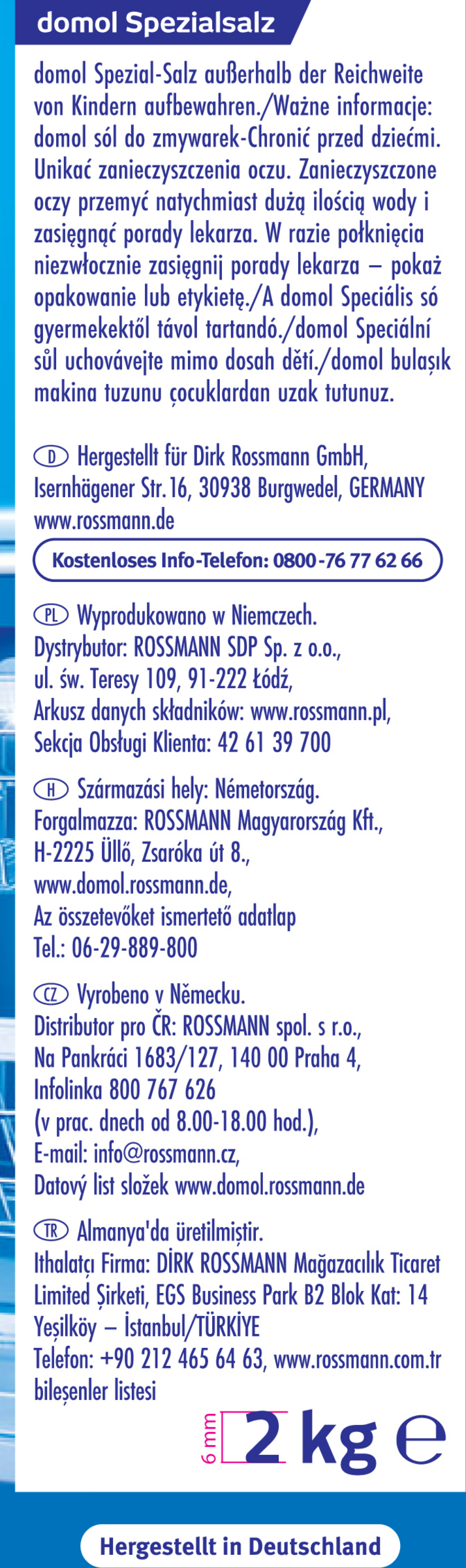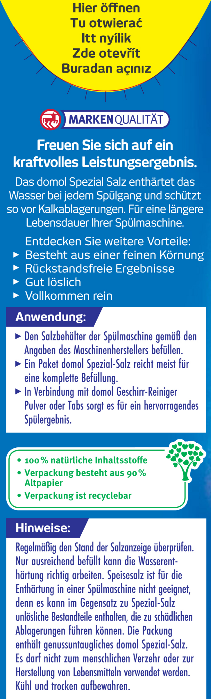 Regelmäßig den Stand der Salzanzeige überprüfen. Nur ausreichend befüllt kann die Wasserenthärtung richtig arbeiten. Speisesalz ist für die Enthärtung in einer Spülmaschine nicht geeignet, denn es kann im Gegensatz zu Spezial-Salz unlösliche Bestandteile enthalten, die zu schädlichen Ablagerungen führen können. Die Packung enthält genussuntaugliches domol Spezial-Salz. Es darf nicht zum menschlichen Verzehr oder zur Herstellung von Lebensmitteln verwendet werden.