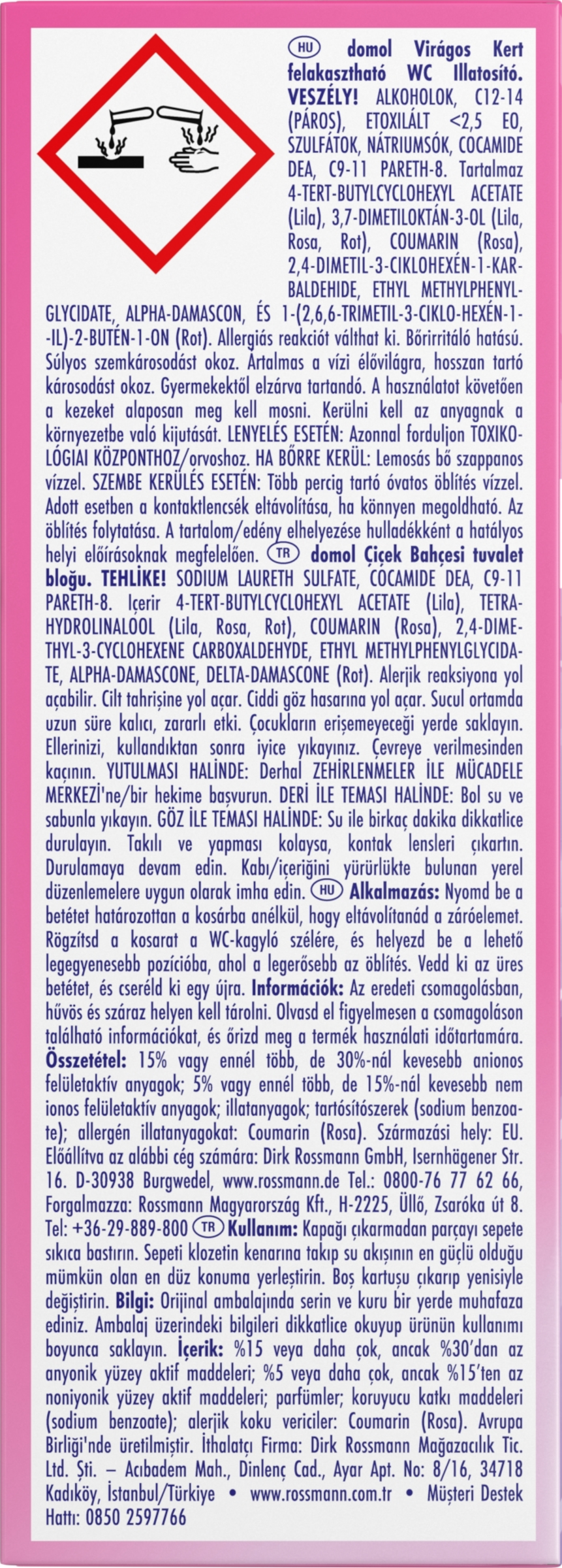 SODIUM LAURETH SULFATE, COCAMIDE DEA, C9-11 PARETH-8. Enthält 4-TERT-BUTYLCYCLOHEXYL ACETATE (Lila), TETRAHYDROLINALOOL (Lila, Rosa, Rot), COUMARIN (Rosa), 2,4-DIMETHYL-3-CYCLOHEXENE CARBOXALDEHYDE, ETHYL METHYLPHENYLGLYCIDATE, ALPHA-DAMASCONE, DELTA-DAMASCONE (Rot). Kann allergische Reaktionen hervorrufen. Verursacht Hautreizungen. Verursacht schwere Augenschäden. Schädlich für Wasserorganismen, mit langfristiger Wirkung. Darf nicht in die Hände von Kindern gelangen. Nach Gebrauch Hände gründlich waschen. Freisetzung in die Umwelt vermeiden. BEI VERSCHLUCKEN: Sofort GIFTINFORMATIONSZENTRUM/Arzt anrufen. BEI BERÜHRUNG MIT DER HAUT: Mit viel Wasser und Seife waschen. BEI KONTAKT MIT DEN AUGEN: Einige Minuten lang behutsam mit Wasser spülen. Eventuell vorhandene Kontaktlinsen nach Möglichkeit entfernen. Weiter spülen. Inhalt/Behälter entsprechend den örtlichen Vorschriften der Entsorgung zuführen.