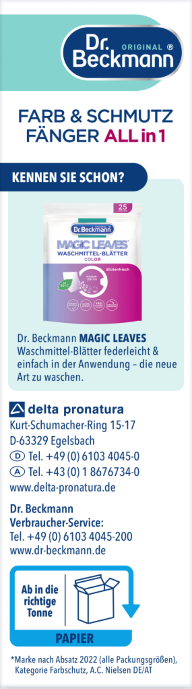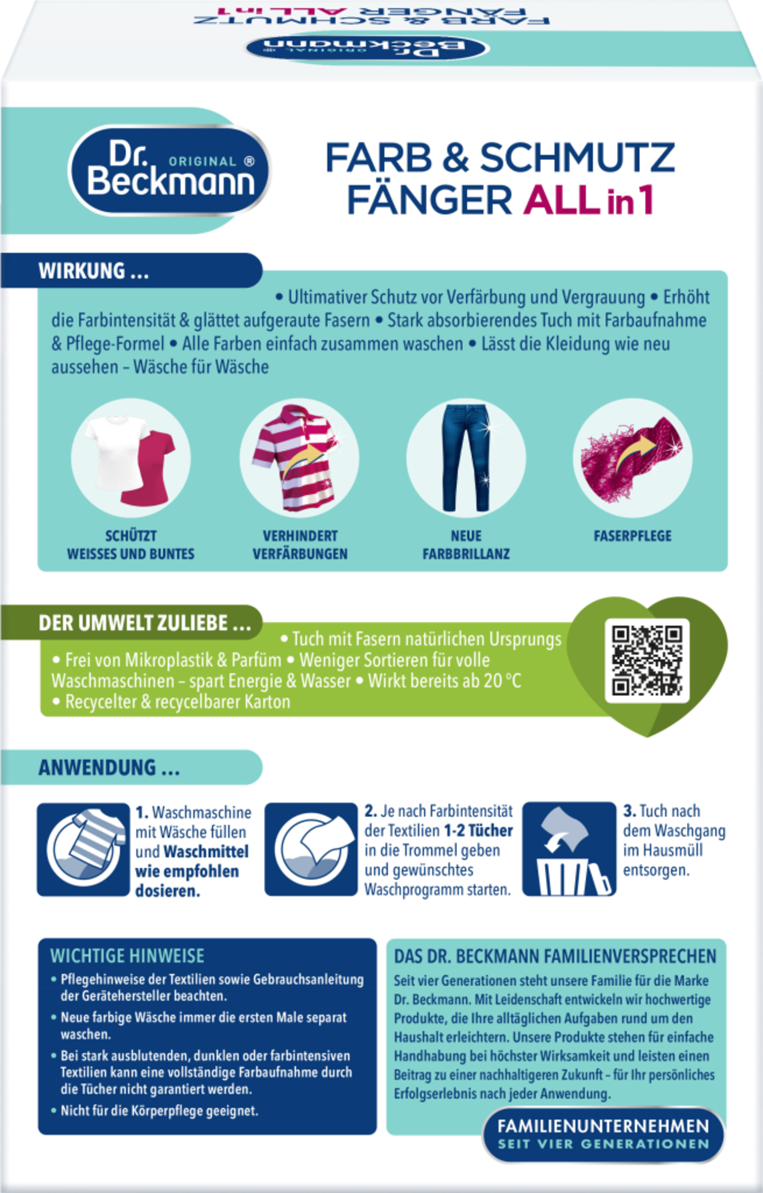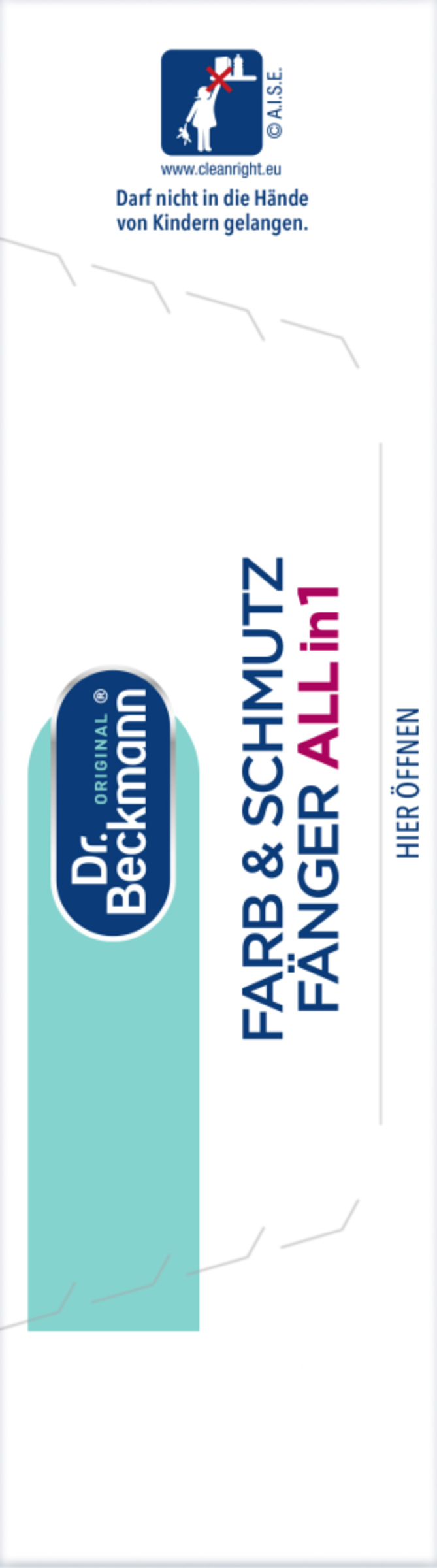Dr. Beckmann Farb & Schmutzfänger-Tücher nehmen die auslaufenden Farben schnell aus dem Wasser auf und binden sie sofort. So bleiben alle Kleidungsstücke zuverlässig vor Verfärbungen geschützt, insbesondere Textilien mit Weißanteil.