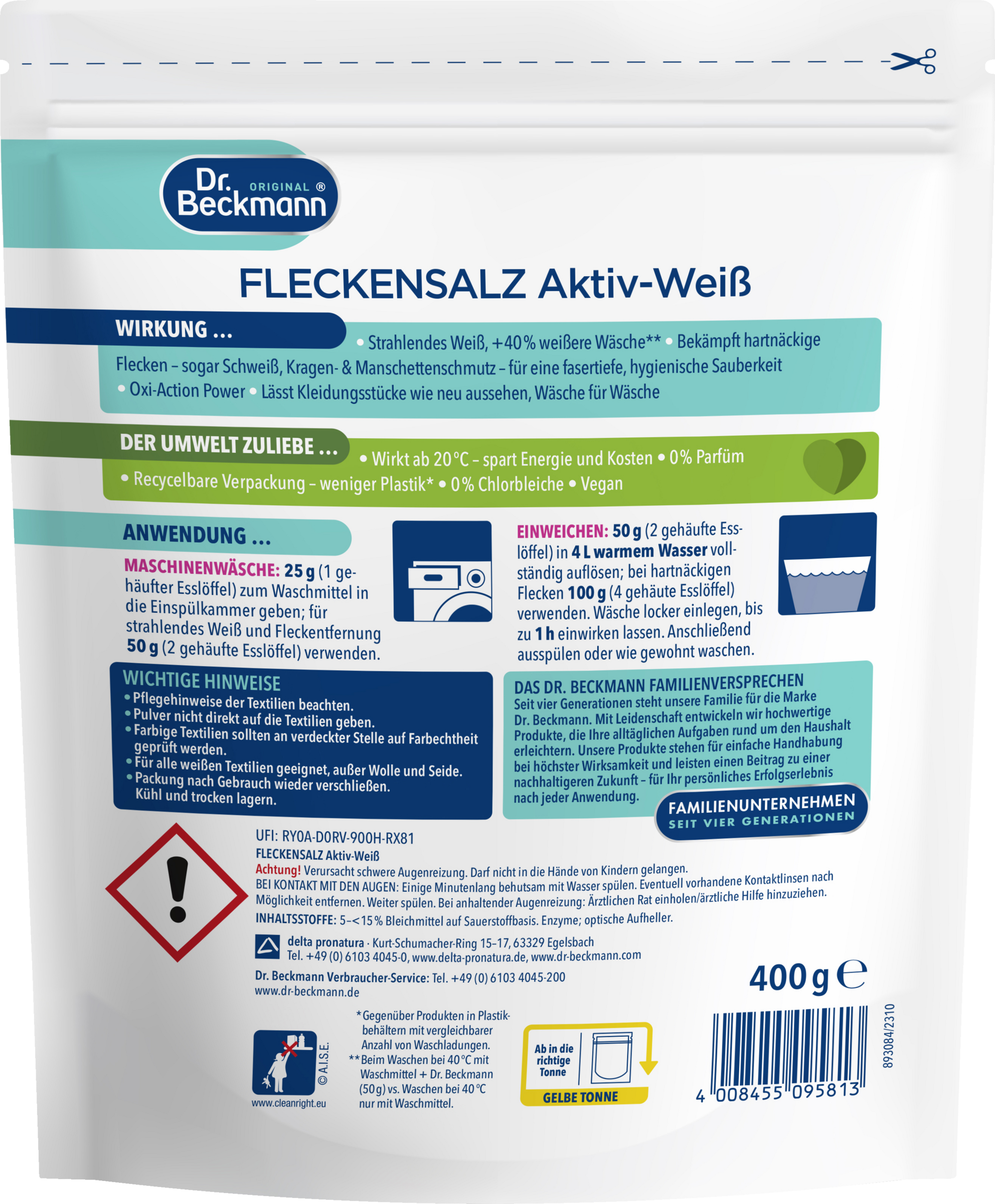 Fleckensalz Aktiv-Weiß ist ein hochwirksamer Waschzusatz für strahlendes Weiß. Es schont die Faser und lässt Kleidung und Textilien nach der Anwendung wie neu aussehen.