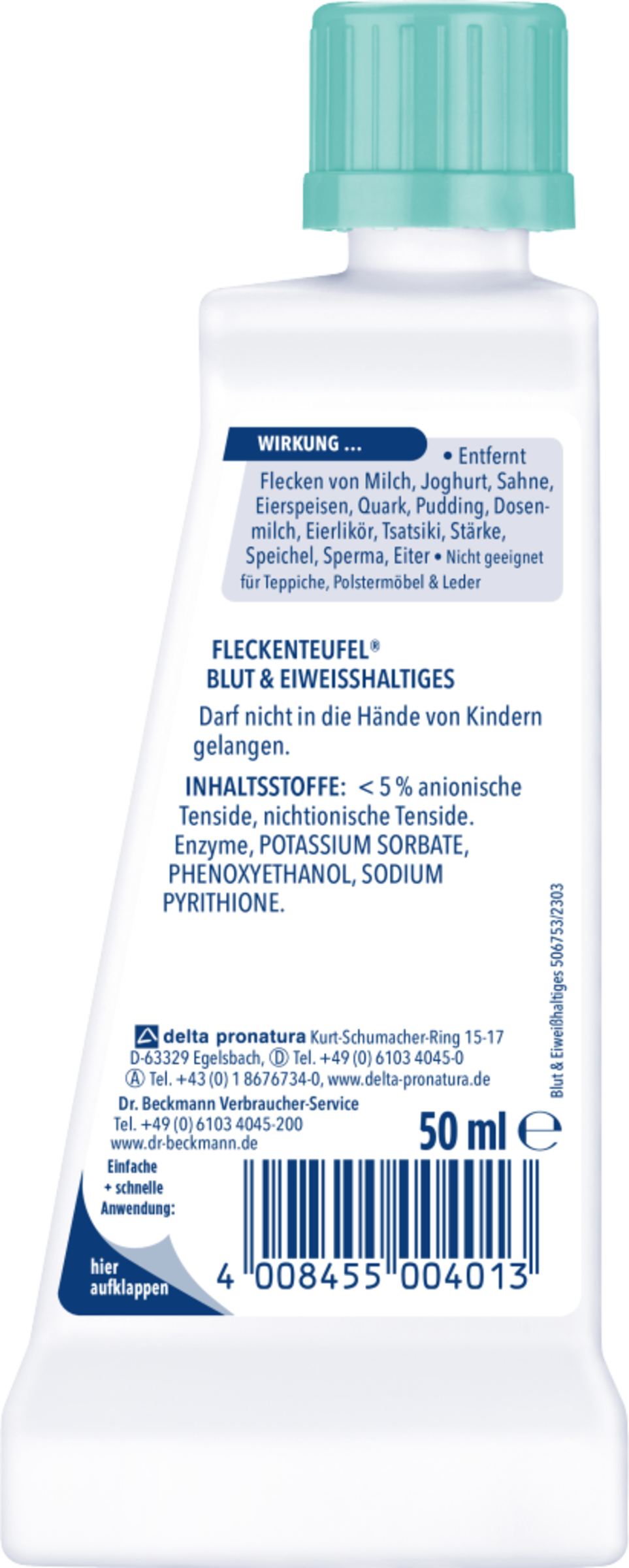 Entfernt Blut, Eis, Ei, Milch, Joghurt & Sahne. Entfernt zusätzlich Flecken von: Eierspeisen, Quark, Pudding, Dosenmilch, Eierlikör, Tzatziki, Stärke, Speichel, Sperma & Eiter.