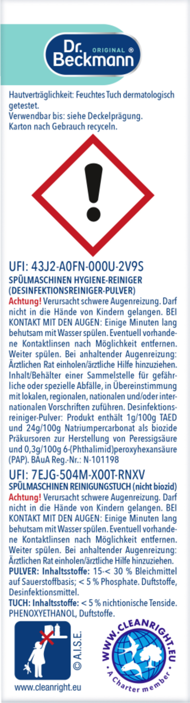 Die Reinigung der Spülmaschine ist nicht gleichzeitig mit dem Spülvorgang des Geschirrs erledigt. Denn bei jedem Spülvorgang können Schmutz- und Reinigerrückstände in Dichtungen, Fugen und an verdeckten Stellen zurückbleiben. Mit der Zeit können diese Rückstände zu unangenehmen Gerüchen und Funktionsstörungen führen. Der Dr. Beckmann Spülmaschinen-Hygiene Reiniger beugt dem nicht nur vor, sondern entfernt auch zuverlässig 99,9% der Bakterien und Pilze in Ihrer Spülmaschine. Mit dem Spezial-Tuch werden Gummidichtungen und Kanten gereinigt und gepflegt. Das Pulver reinigt die Spülmaschine hygienisch von innen. Besonders schwer erreichbare Teile wie Sieb, Abfluss, Wasserpumpe und Sprüharme werden hygienisch sauber und befreit von Gerüchen. Denn nur eine saubere Maschine sorgt für sauberes Geschirr und Besteck.