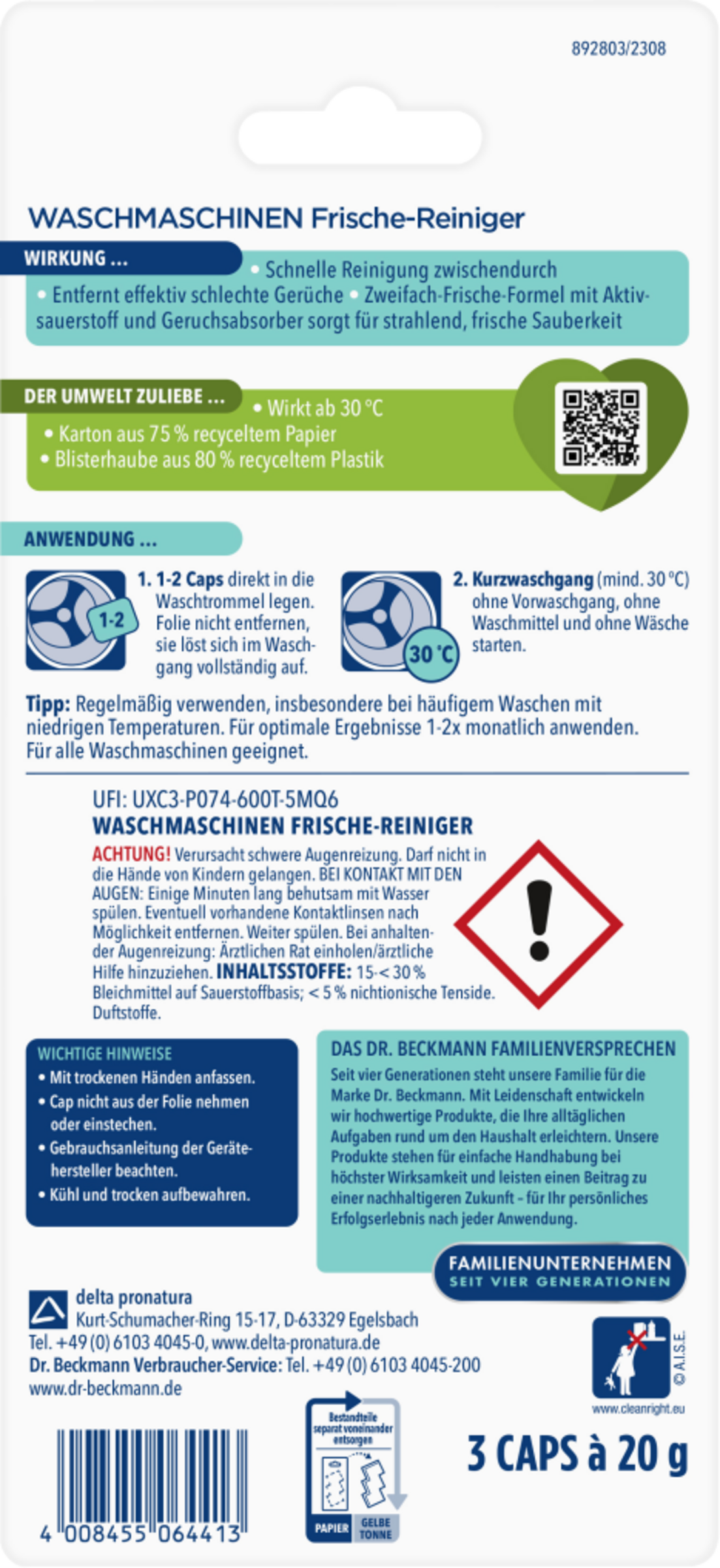 Waschmaschinen Frische-Reiniger wurde für die einfache und schnelle Reinigung und Erfrischung zwischendurch entwickelt. Neutralisiert Gerüche. Folie der Caps lösen sich im Wasser auf. Mit frischem Duft.