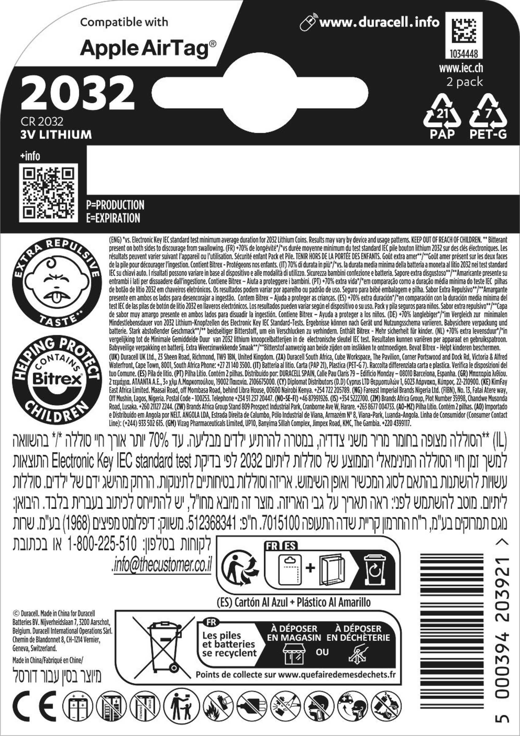 Duracell CR2032 Lithium Knopfzellen haben eine 70 % zusätzliche Lebensdauer* für Ihre spezifischen elektronischen Geräte. Duracell ist die Batteriemarke Nr. 1, was die Kindersicherheit betrifft – dank der bitter schmeckenden, ringförmigen Schicht auf der Zelle und der babysicheren Verpackung mit Doppelblister, die sich ohne Schere schwer öffnen lässt. Sie sind geeignet für die Verwendung in Schlüsselanhängern, Heim-Geräten wie kleinen Fernbedienungen, Fitnessgeräten und anderen Wearables, medizinischen Geräten (Blutzuckermessgeräte, digitale Thermometer), Waagen, Sensoren und Sportgeräten (Herzfrequenzmonitore, Fahrradzubehör).Und mit einer Lagerungsgarantie von bis zu 10 Jahren können Sie sich sicher sein, dass die Batterien funktionieren, wenn Sie sie brauchen.
