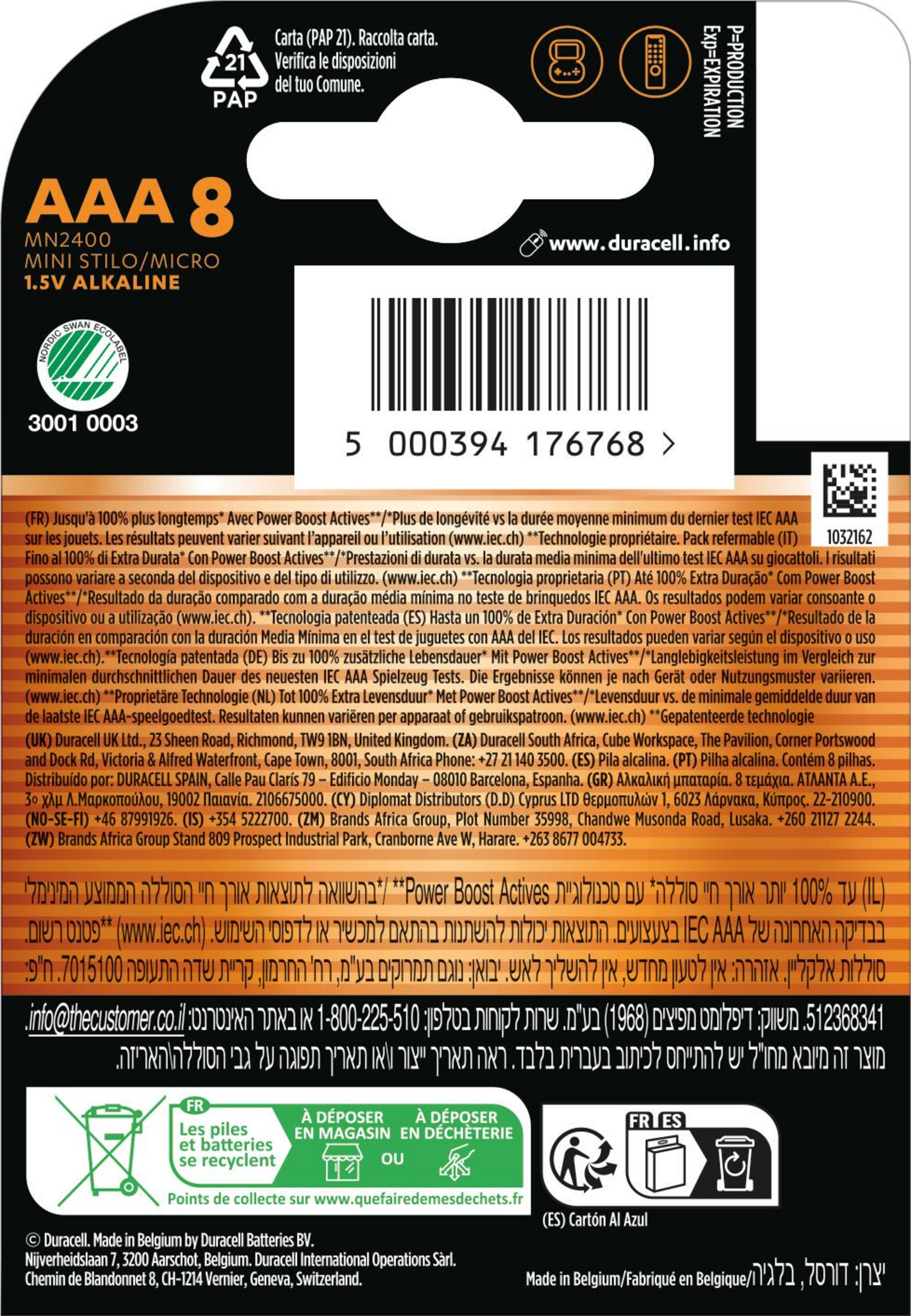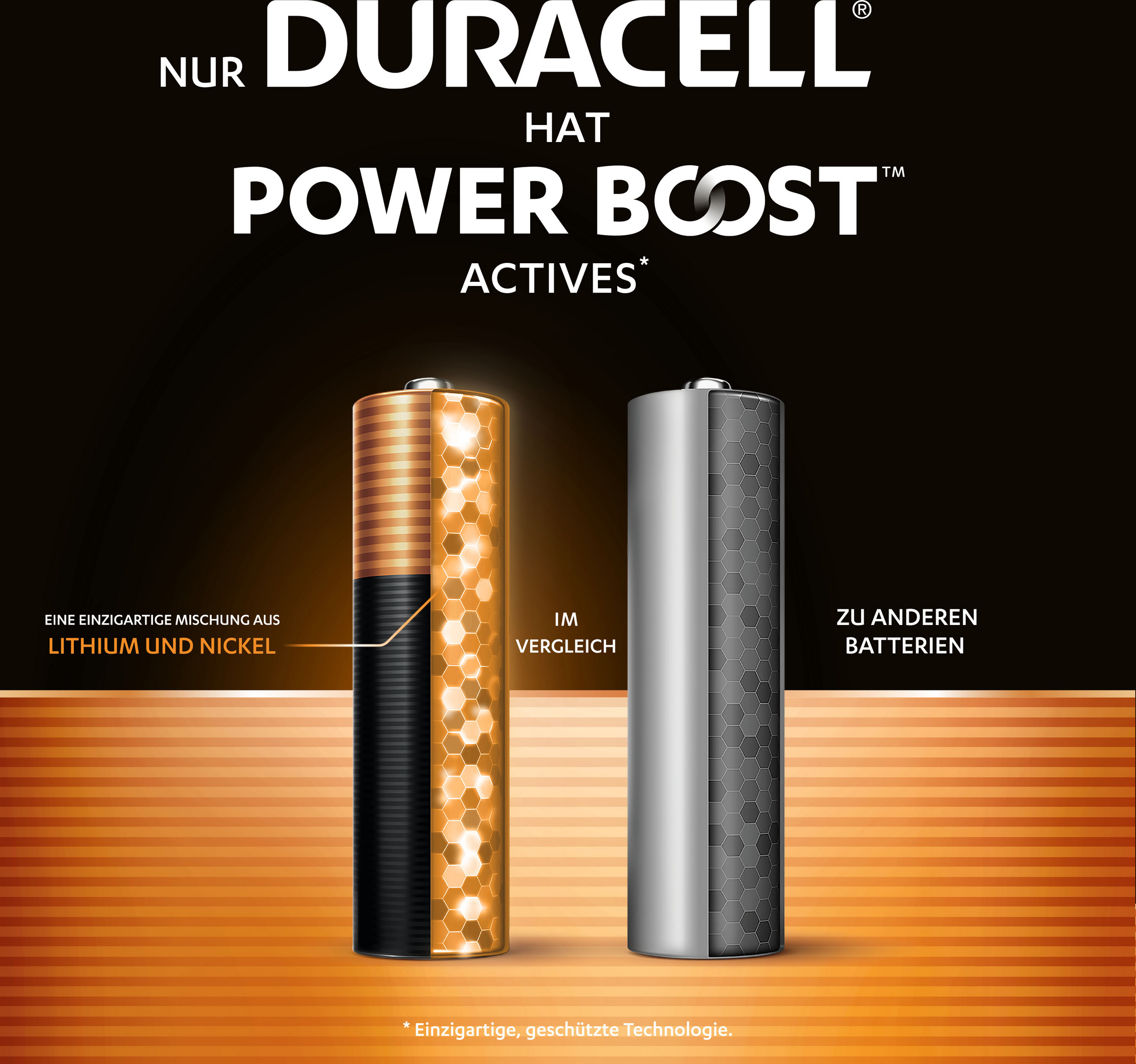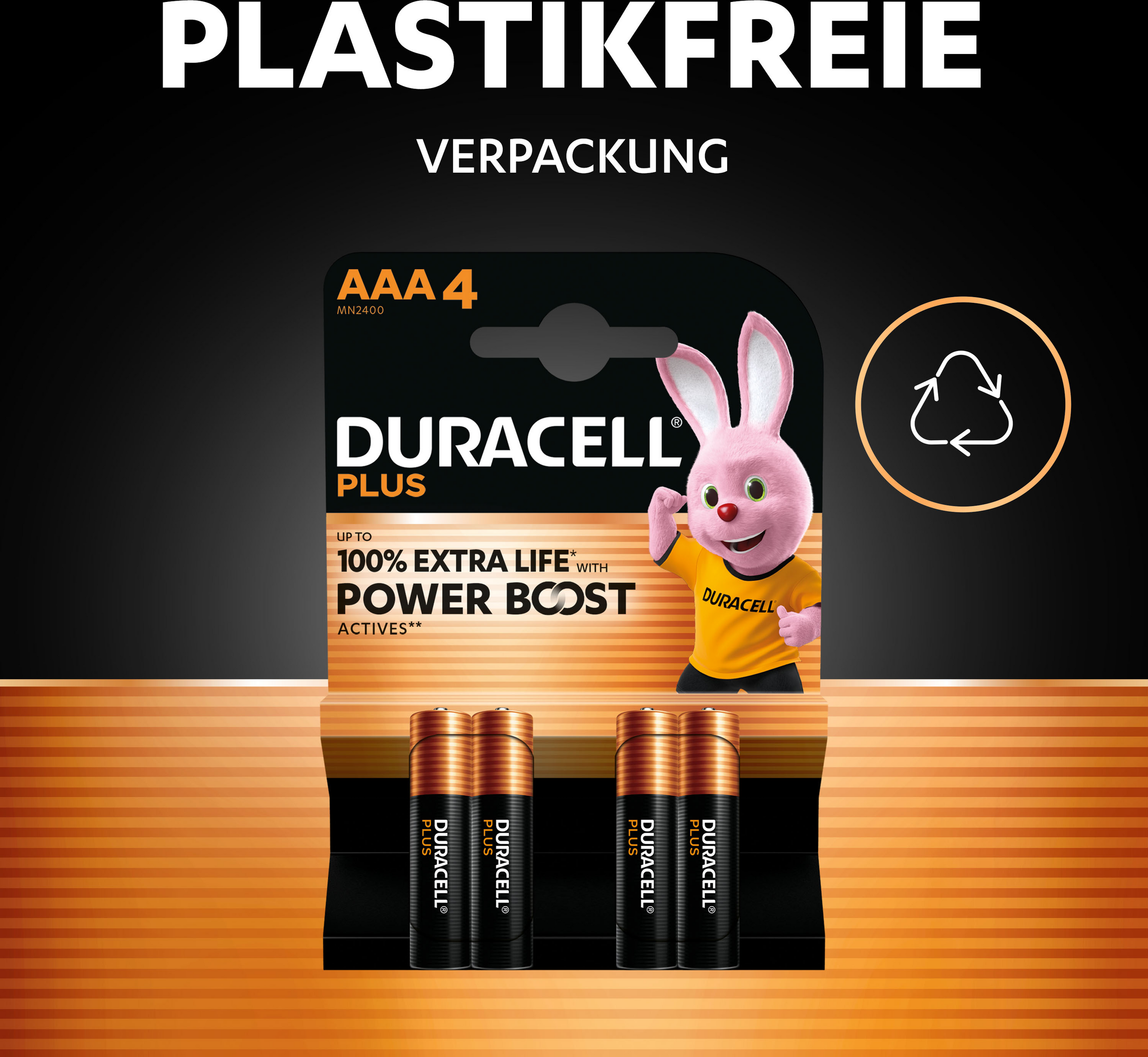 Duracell Plus AAA Alkaline Batterien sind ideal für die Stromversorgung Ihrer Alltagsgeräte und bieten mit den patentierten POWER BOOST Actives** bis zu 100 % mehr Lebensdauer*. POWER BOOST Actives** bestehen aus einer einzigartigen Mischung aus Lithium und Nickel, die für eine lang anhaltende Leistung Ihrer Geräte sorgt. Die einzigartige Nylon-Abdeckung verhindert ein Auslaufen, während die Verpackung aus 0 % Plastik recycelbar ist. Dank der Lagerungsgarantie von 10 Jahren*** können Sie sich darauf verlassen, dass Duracell Plus Power liefert, wann immer Sie sie benötigen.