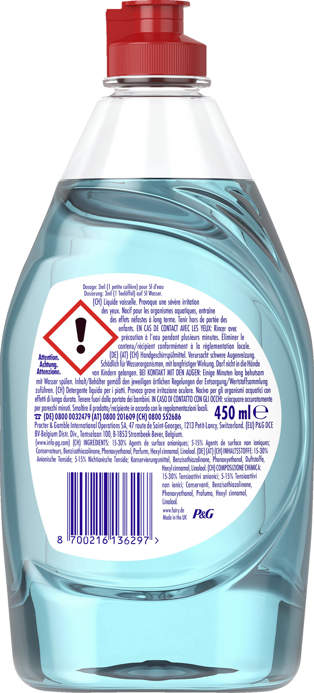 15-30% Anionische Tenside, 5-15% Nichtionische Tenside, Benzisothiazolinone, Phenoxyethanol, Duftstoffe, Hexyl Cinnamal, Linalool.