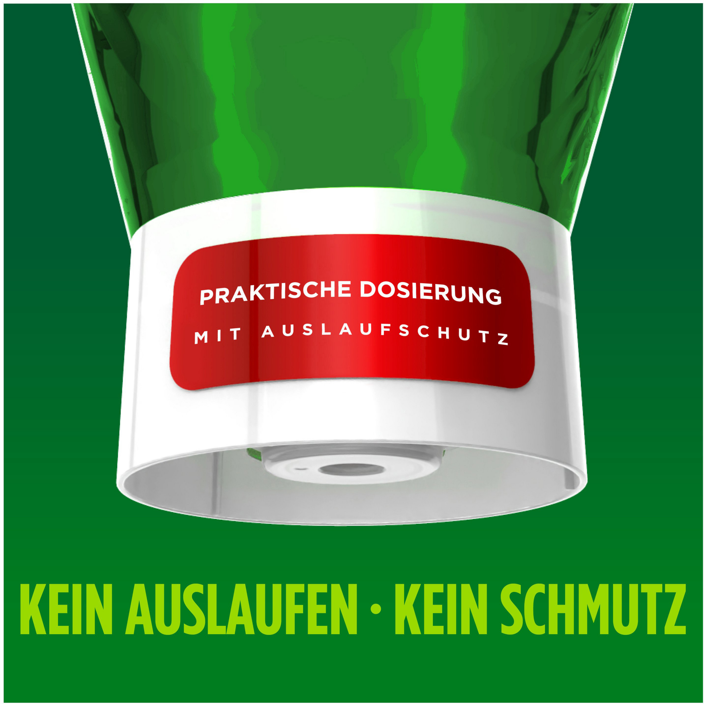 Bei der ersten Anwendung: Siegel entfernen und 2 Sekunden lang dosieren. Dosierung: 3ml (1 Teelöffel) auf 5l Wasser.