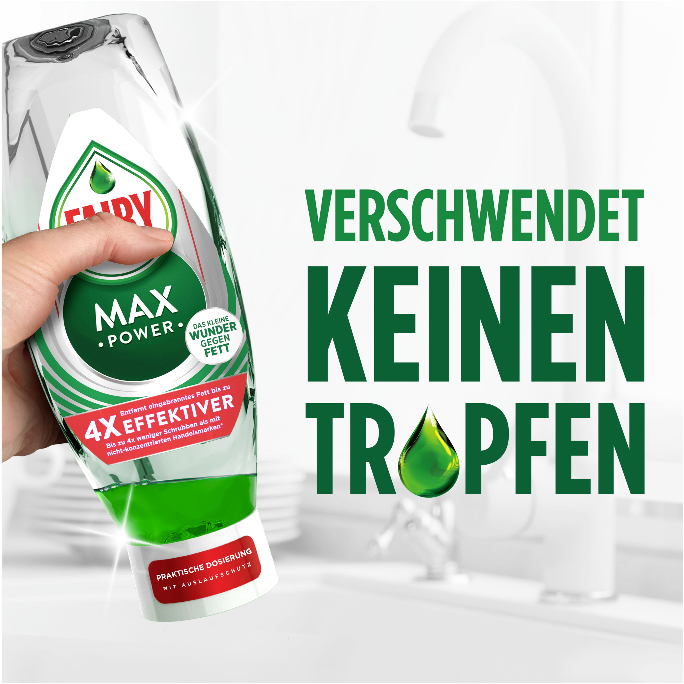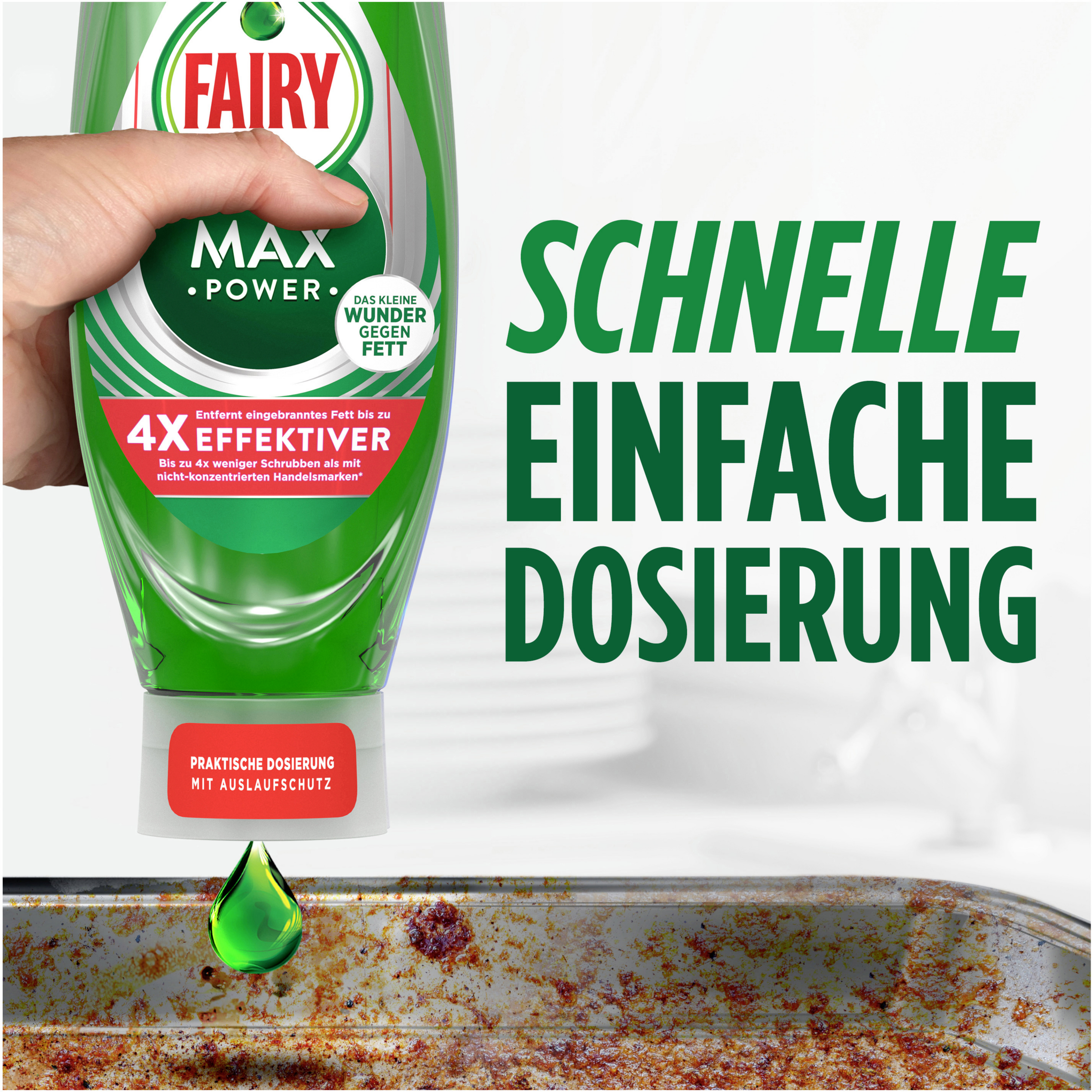 Fairy MaxPower Handgeschirrspülmittel wird in einer kopfstehenden Flasche ohne Drehverschluss geliefert - für Fairys ultimativ bequemes Reinigungserlebnis. Durch schnelles und einfaches Spülen verbringen sie weniger Zeit in der Küche.