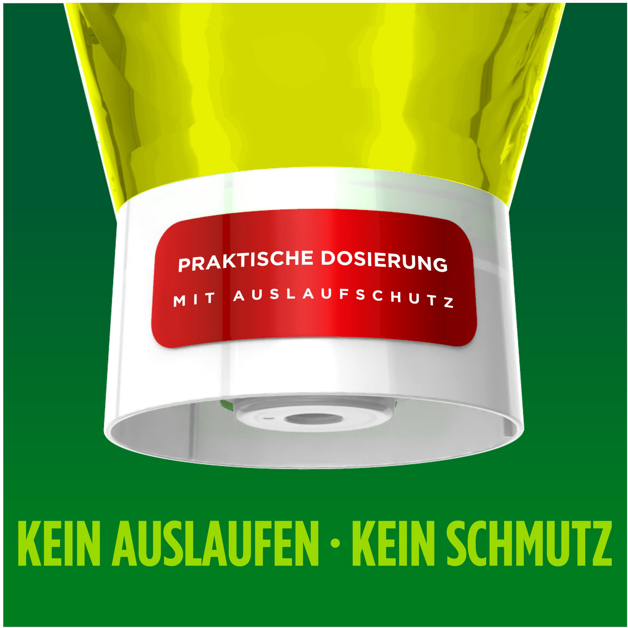 Bei der ersten Anwendung: Siegel entfernen und 2 Sekunden lang dosieren. Dosierung: 3ml (1 Teelöffel) auf 5l Wasser.