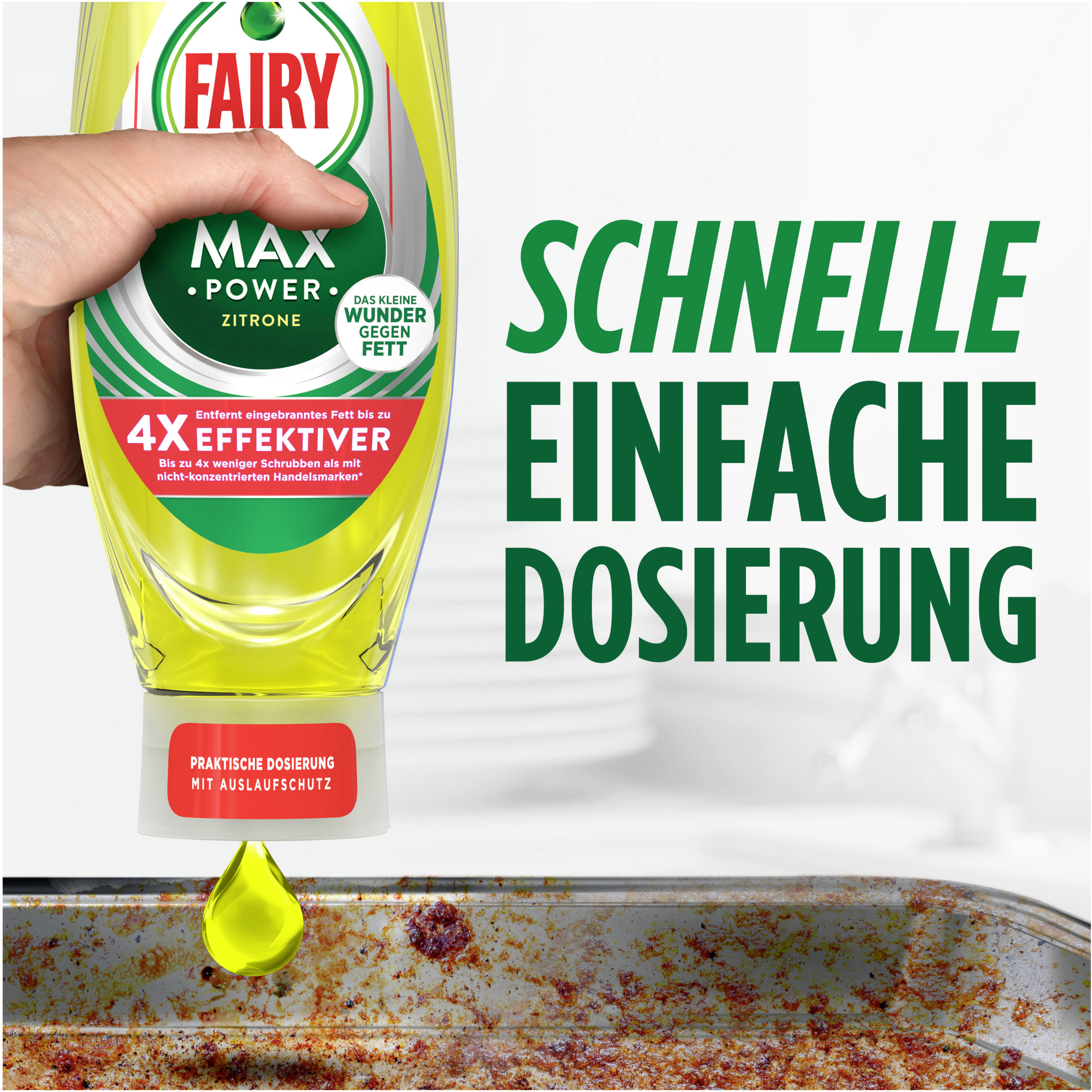Mit Fairy Max Power wird Ihr Abwasch noch einfacher - Dank der praktischen kopfstehenden Flasche - für eine schnelle und einfache Dosierung. Die Kappe verfügt über einen Auslaufschutz, der es ermöglicht, die benötigte Menge bis zum letzten Tropfen herauszudrücken - für weniger Schmutz und weniger Abfall. Fairy entfernt hartnäckiges Fett und Schmutz mühelos. Dank der hoch konzentrierten Formel müssen Sie weniger Schrubben und schon ein Tropfen sorgt dafür, dass ihr Geschirr makellos sauber wird.