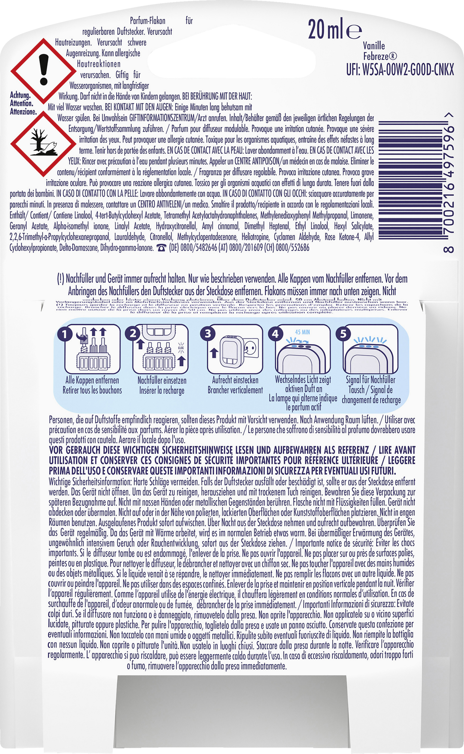 Verursacht Hautreizungen. Verursacht schwere Augenreizung. Kann allergische Hautreaktionen verursachen. Giftig für Wasserorganismen, mit langfristiger Wirkung. Darf nicht in die Hände von Kindern gelangen. BEI BERÜHRUNG MIT DER HAUT: Mit viel Wasser waschen. BEI KONTAKT MIT DEN AUGEN: Einige Minuten lang behutsam mit Wasser spülen. Bei Unwohlsein GIFTINFORMATIONSZENTRUM/Arzt anrufen. Personen, die auf Duftstoffe empfindlich reagieren, sollten dieses Produkt mit Vorsicht verwenden. Nach Anwendung Raum lüften. VOR GEBRAUCH DIESE WICHTIGEN SICHERHEITSHINWEISE LESEN UND AUFBEWAHREN ALS REFERENZ. Wichtige Sicherheitsinformation: Harte Schläge vermeiden. Falls der Duftstecker ausfällt oder beschädigt ist, sollte er aus der Steckdose entfernt werden. Das Gerät nicht öffnen. Um das Gerät zu reinigen, herausziehen und mit trockenem Tuch reinigen. Bewahren Sie diese Verpackung zur späteren Bezugnahme auf. Nicht mit nassen Händen oder metallischen Gegenständen berühren. Flasche nicht mit Flüssigkeiten füllen. Gerät nicht abdecken oder übermalen. Nicht auf oder in der Nähe von polierten, lackierten Oberflächen oder Kunststoffoberflächen platzieren. Nicht in engen Räumen benutzen. Ausgelaufenes Produkt sofort aufwischen. Über Nacht aus der Steckdose nehmen und aufrecht aufbewahren. Überprüfen Sie das Gerät regelmäßig. Da das Gerät mit Wärme arbeitet, wird es im normalen Betrieb etwas warm. Bei übermäßiger Erwärmung des Gerätes, ungewöhnlich intensivem Geruch oder Rauchentwicklung, sofort aus der Steckdose ziehen.